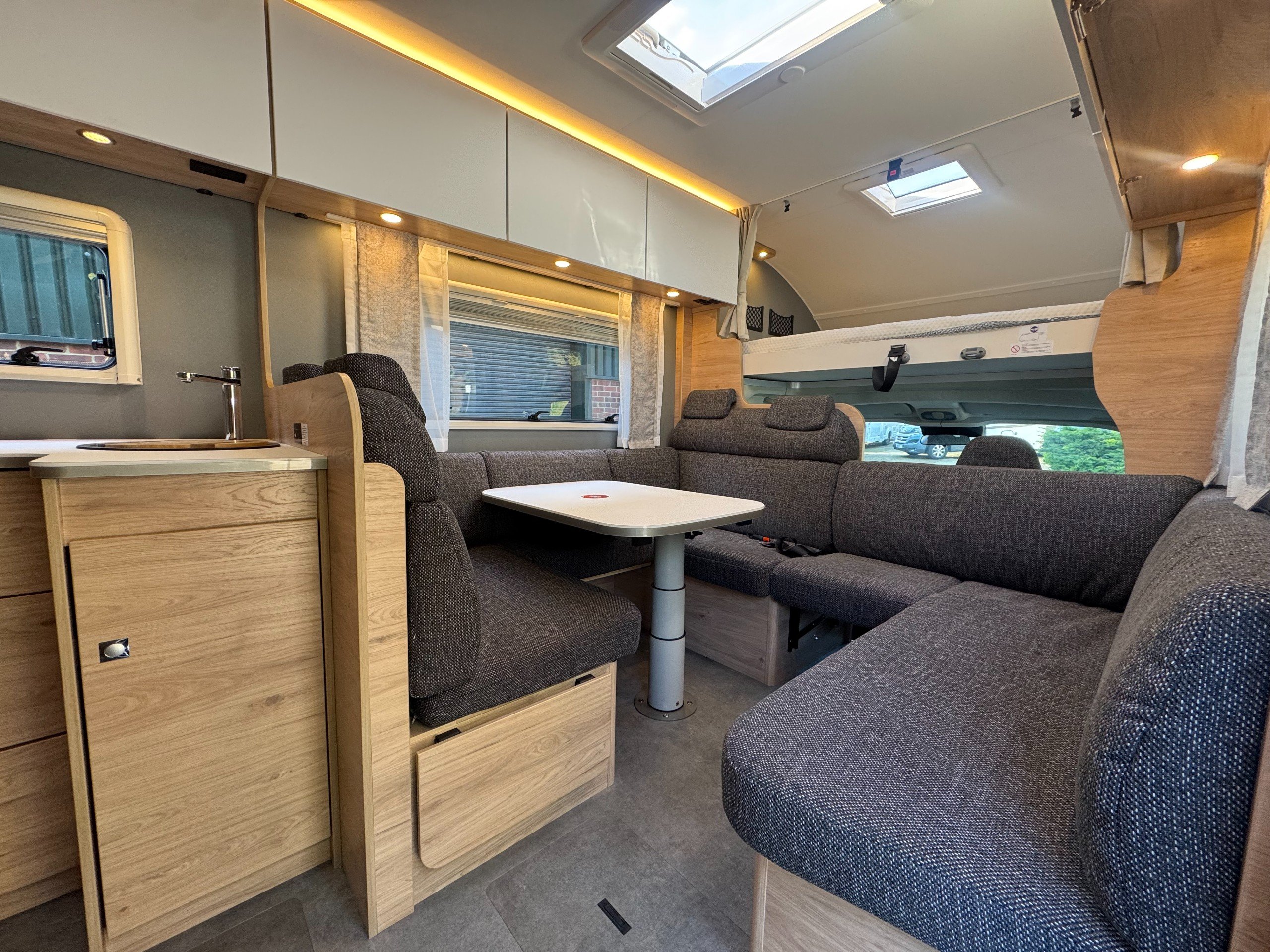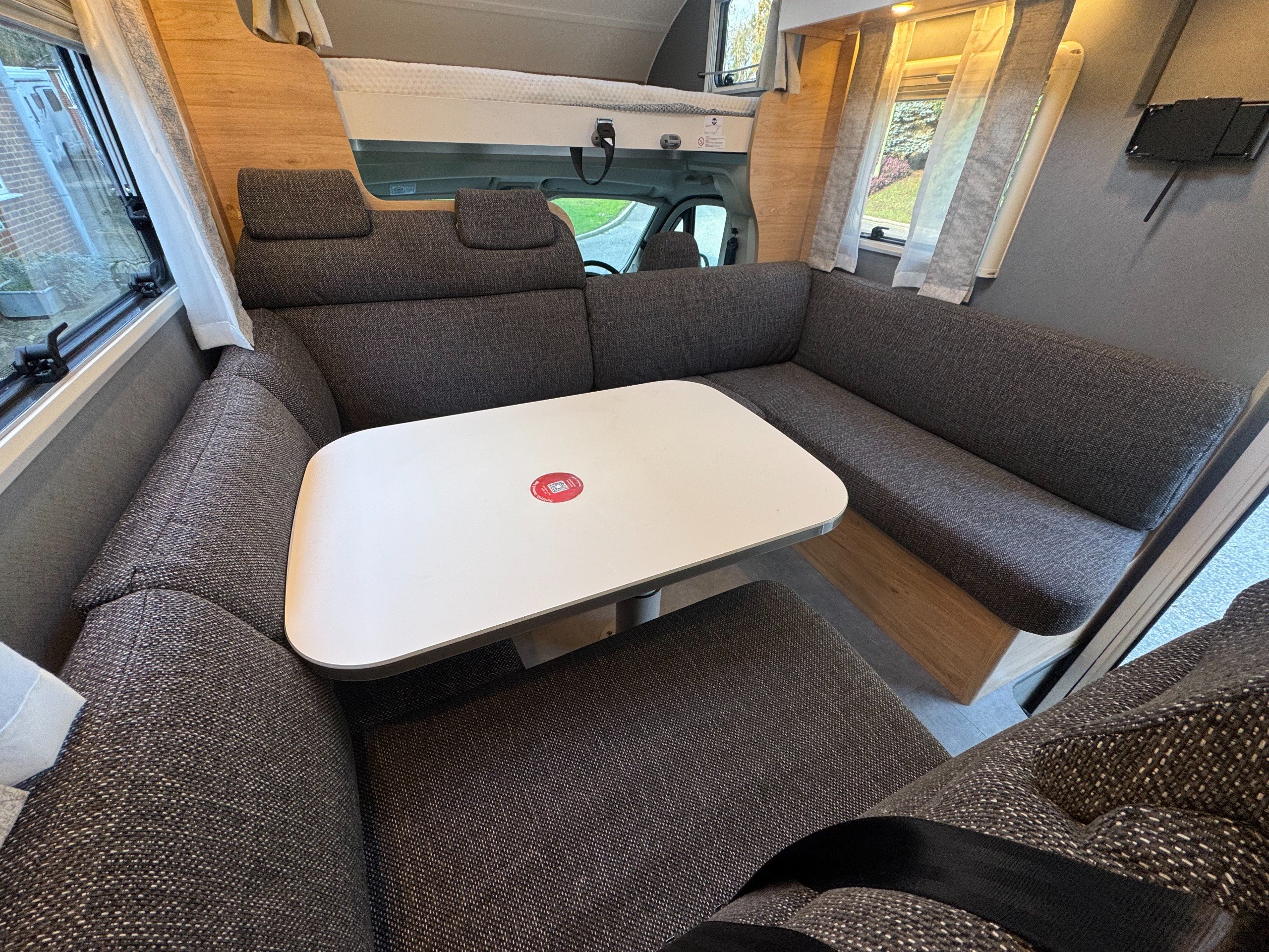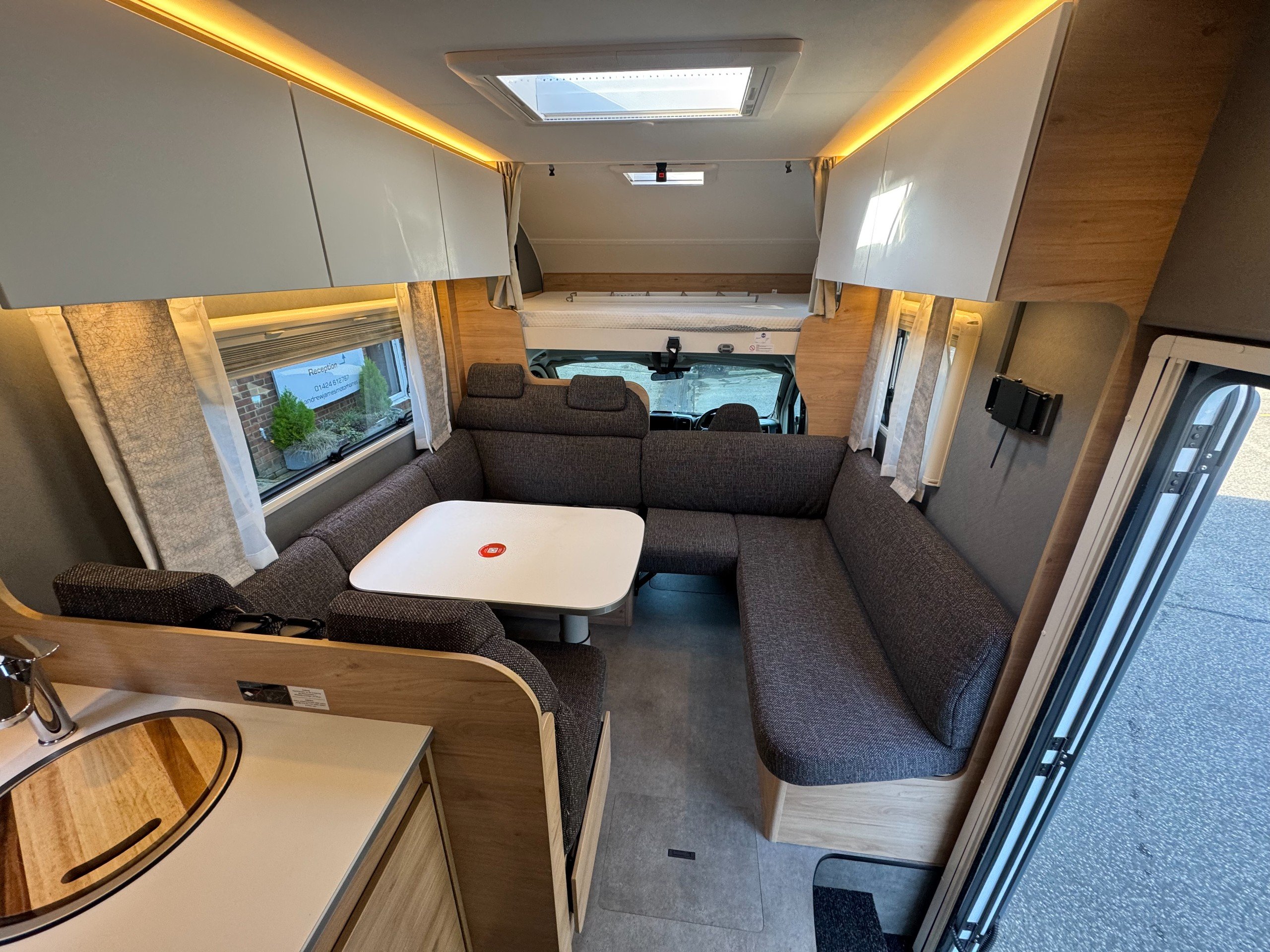 The layout consists of complete round seating option with cushion inserts, lower lounge conversion for double bed option, over cab very large double bed, complete under bench storage and overhead storage cupboards, TV wall bracket (TV options available on request).
