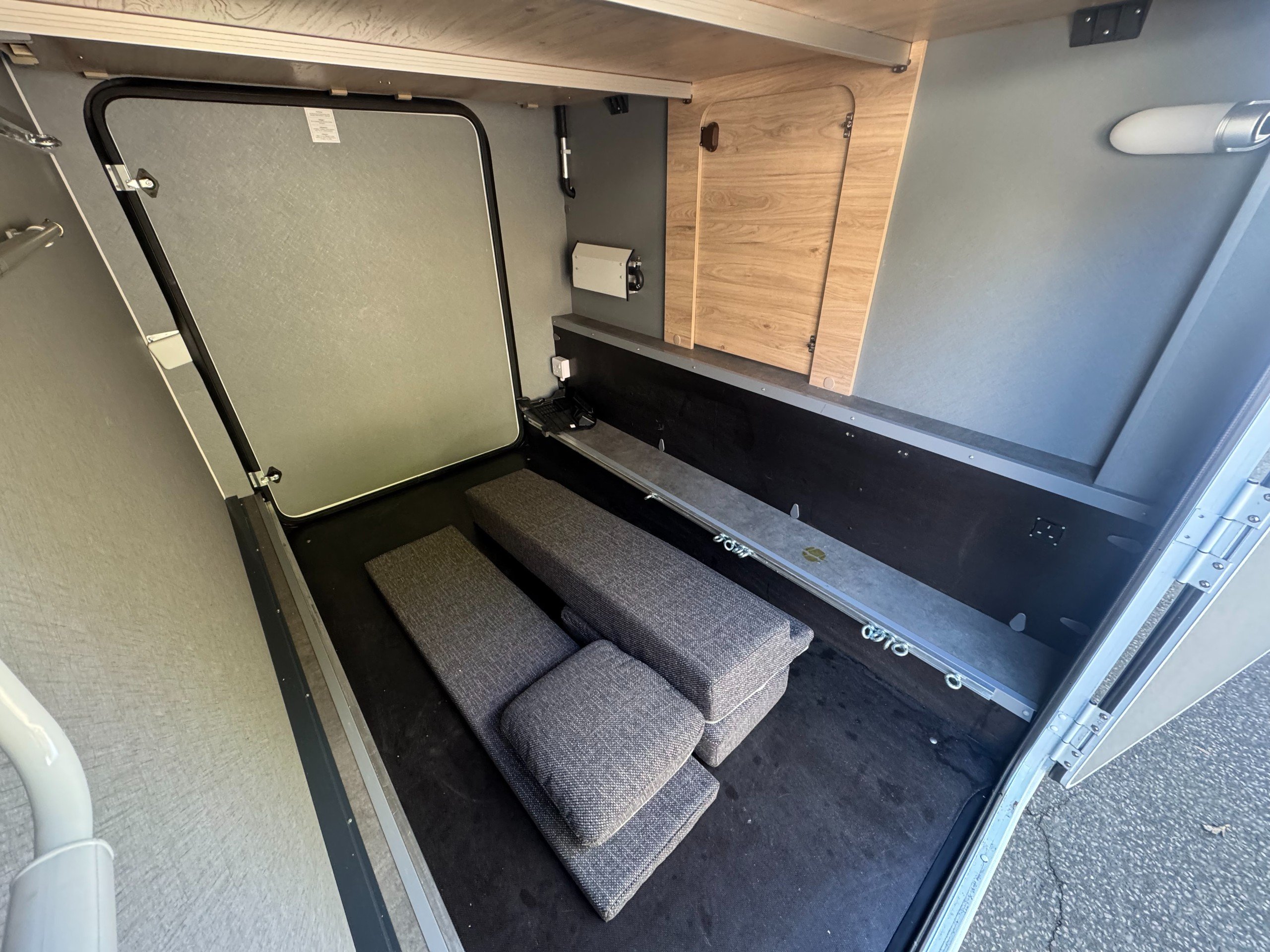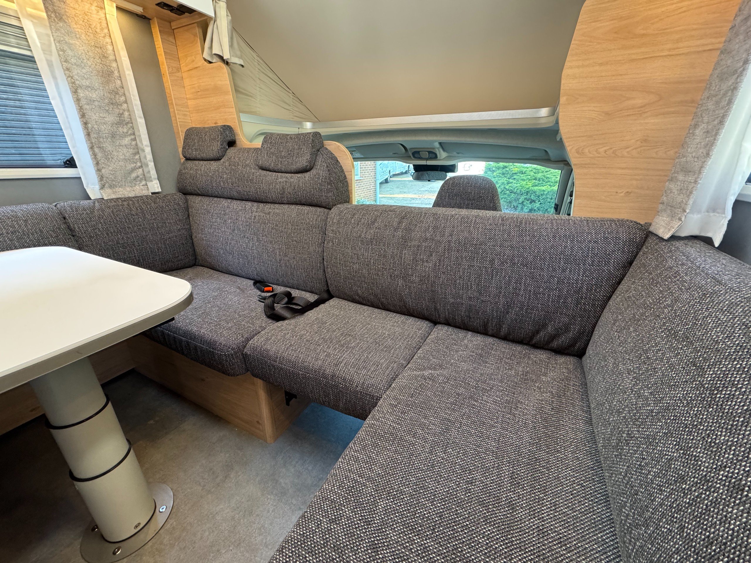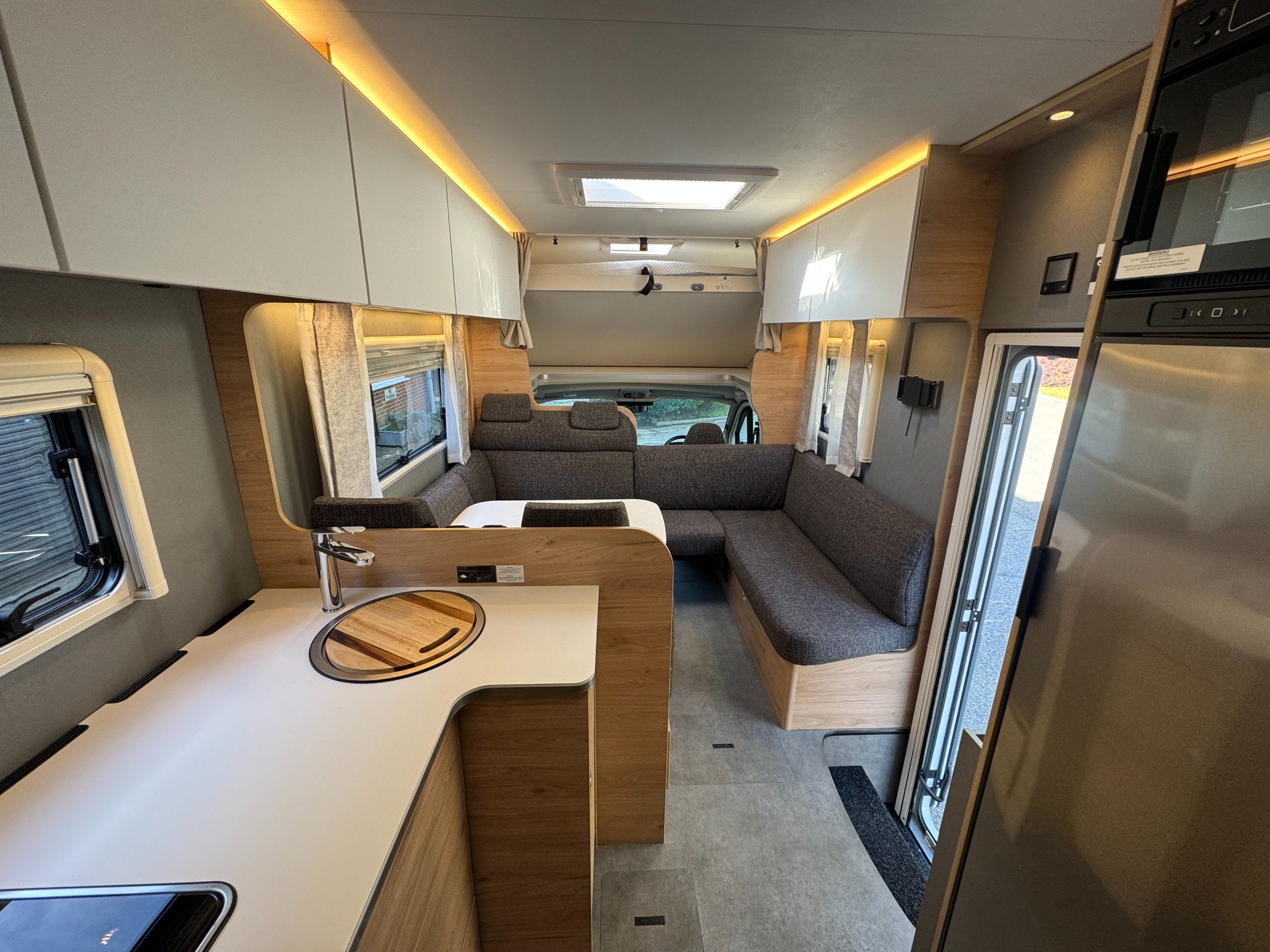 The layout consists of complete round seating option with cushion inserts, lower lounge conversion for double bed option, over cab very large double bed, complete under bench storage and overhead storage cupboards, TV wall bracket (TV options available on request).