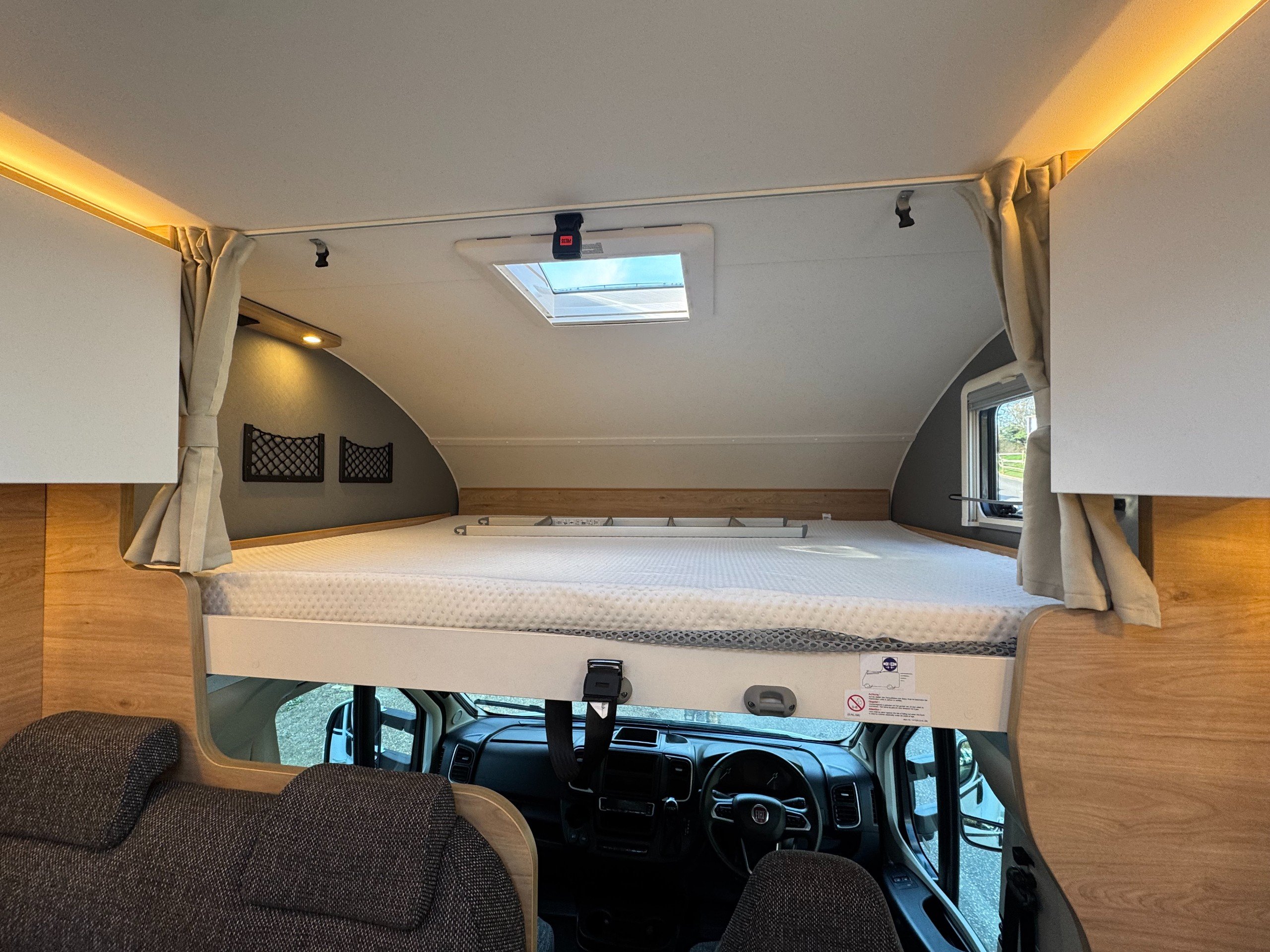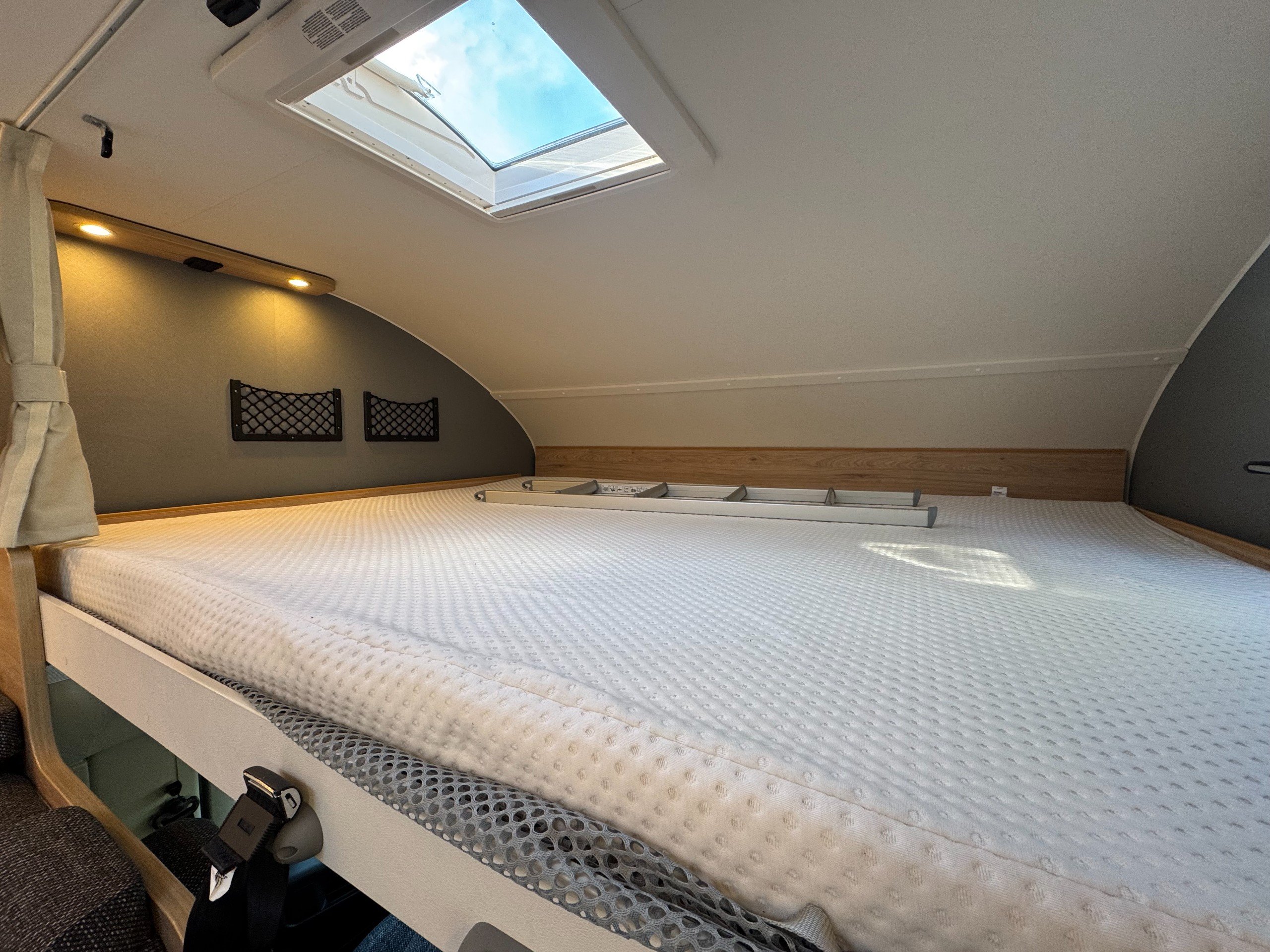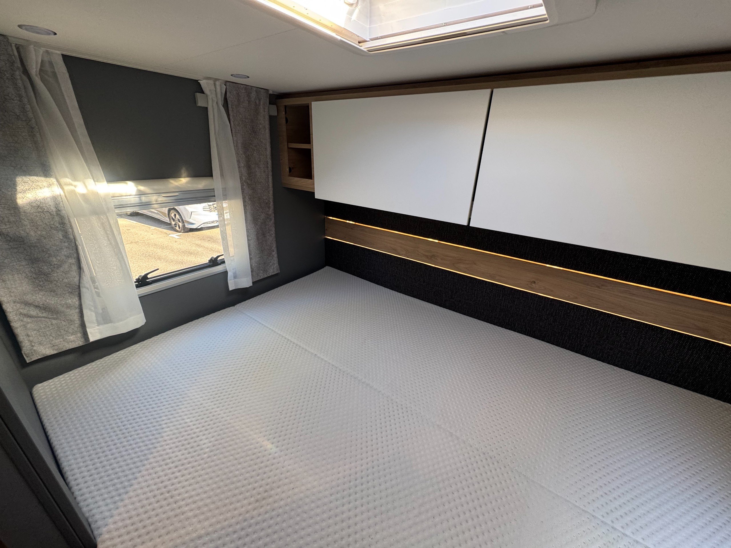 The rear of the motorhome offers transverse double bed with memory foam mattress, overhead storage cupboards, roof sky light and side windows.