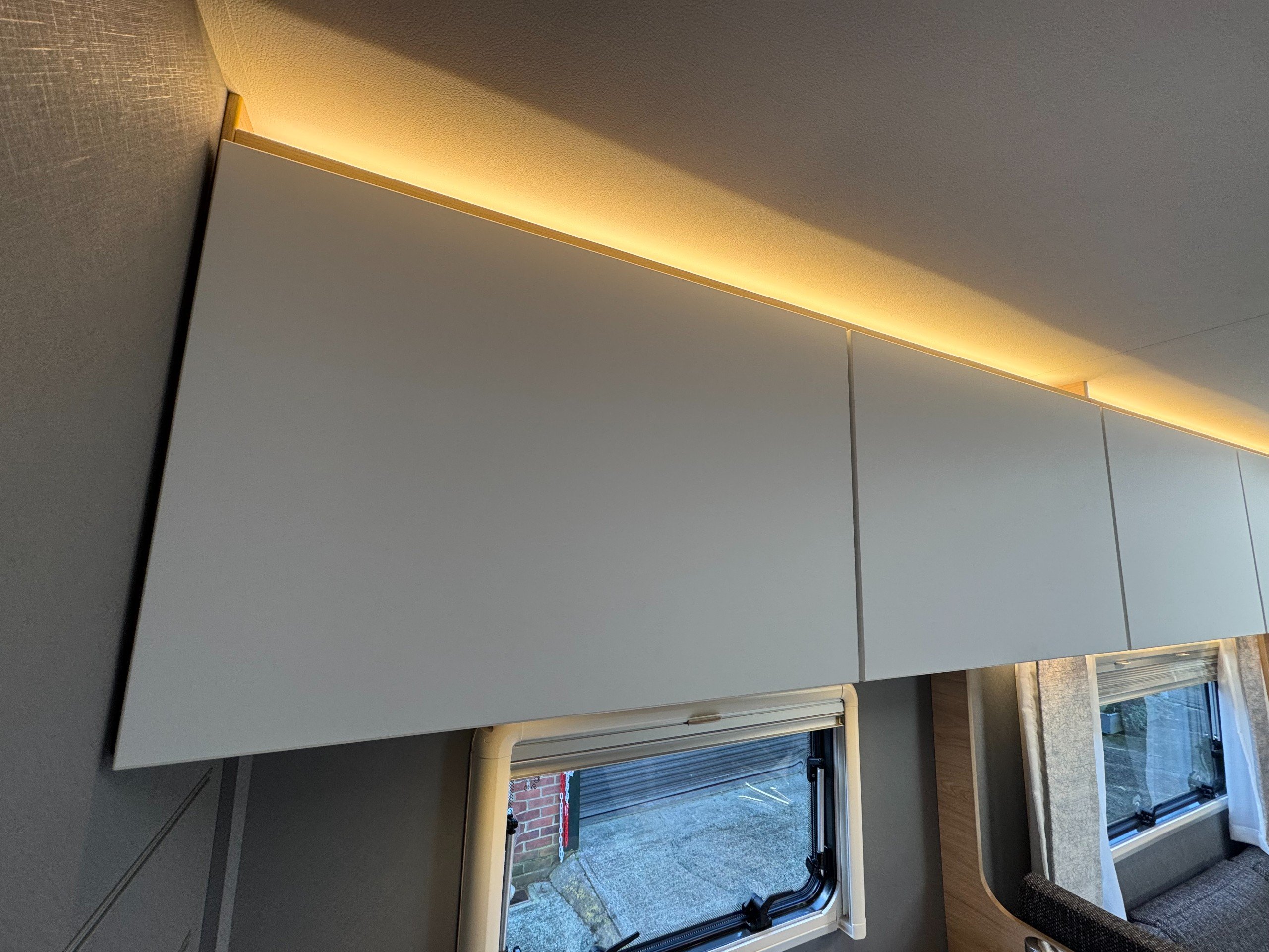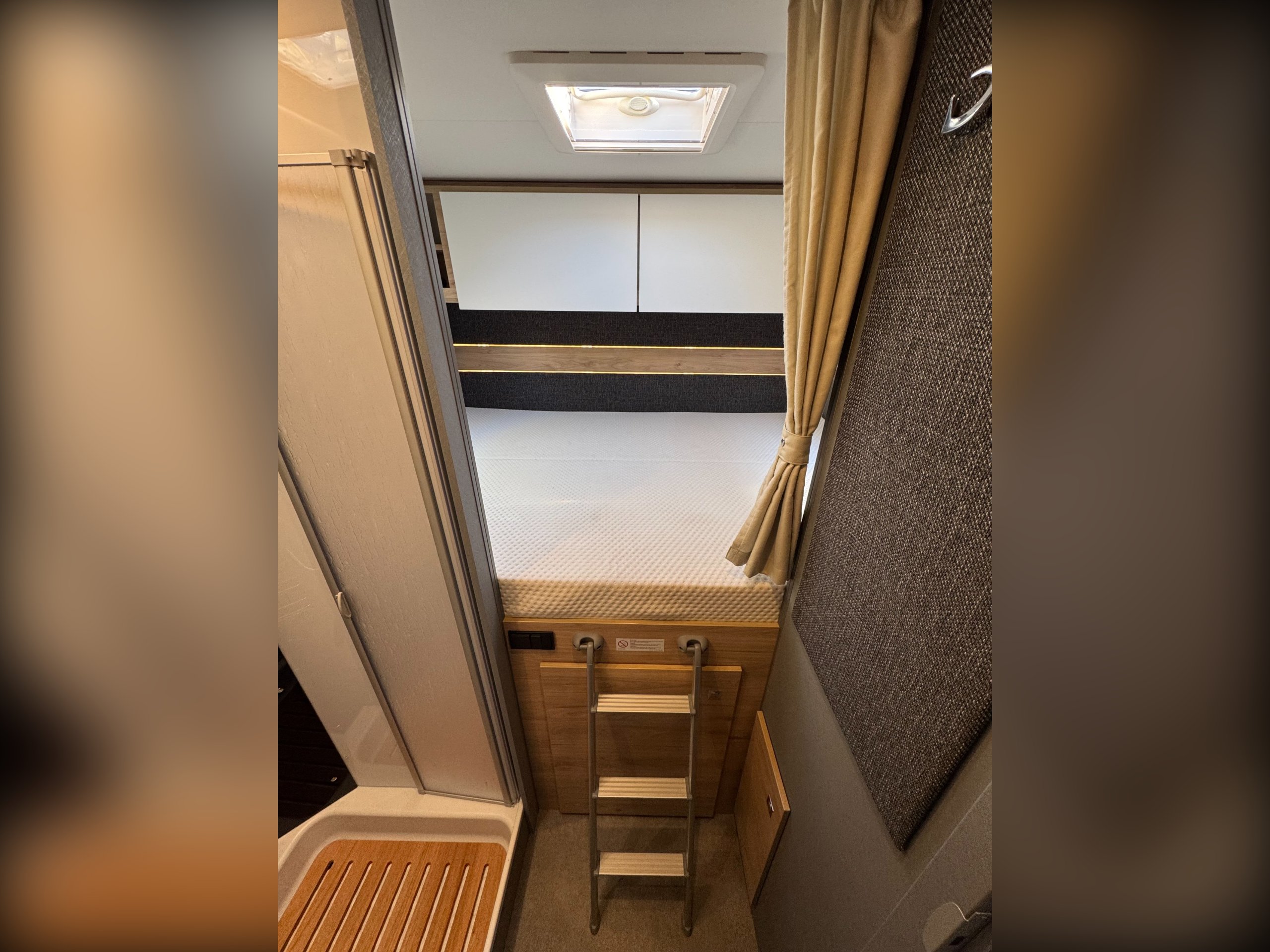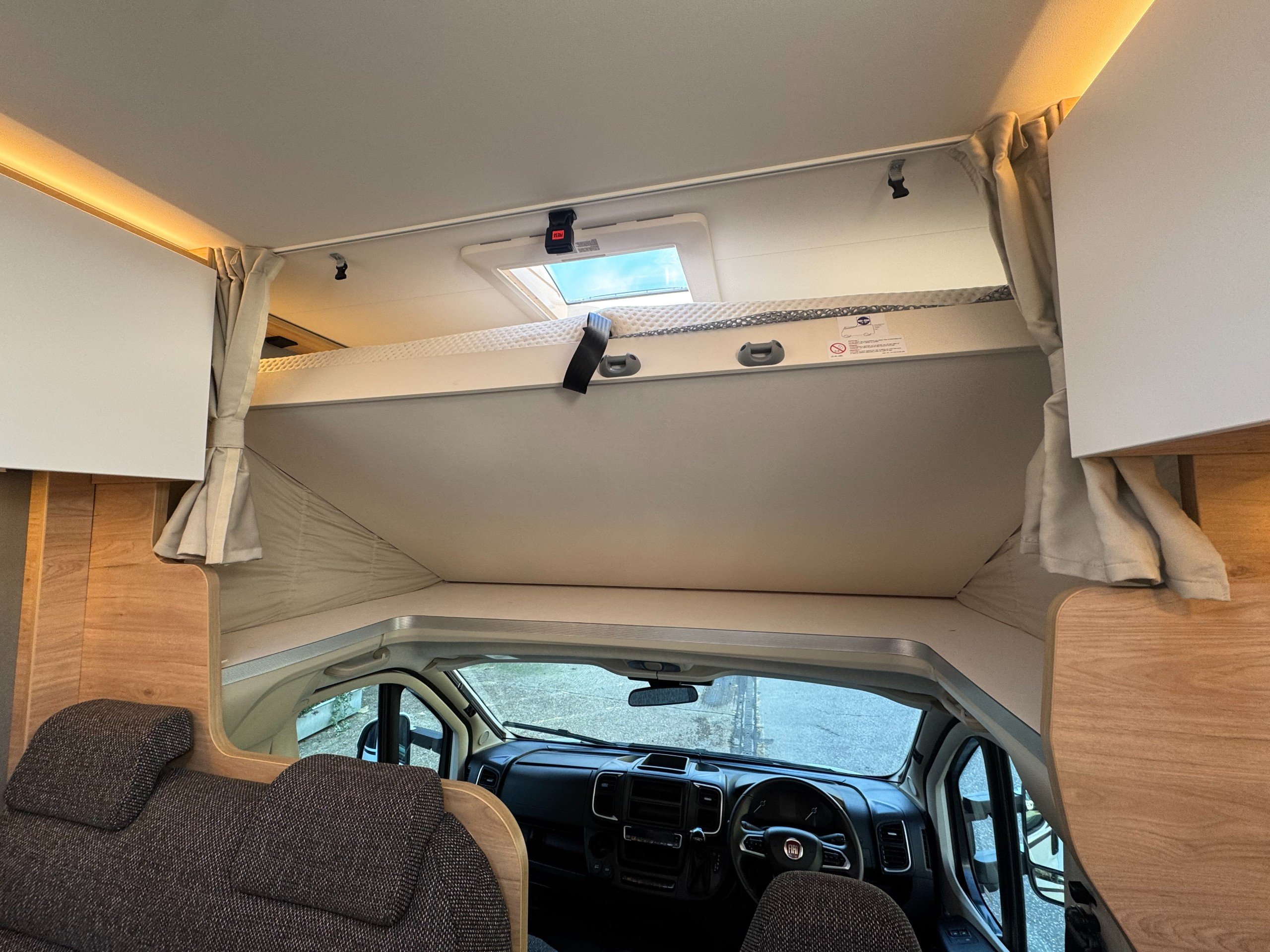 The rear of the motorhome offers transverse double bed with memory foam mattress, overhead storage cupboards, roof sky light and side windows.