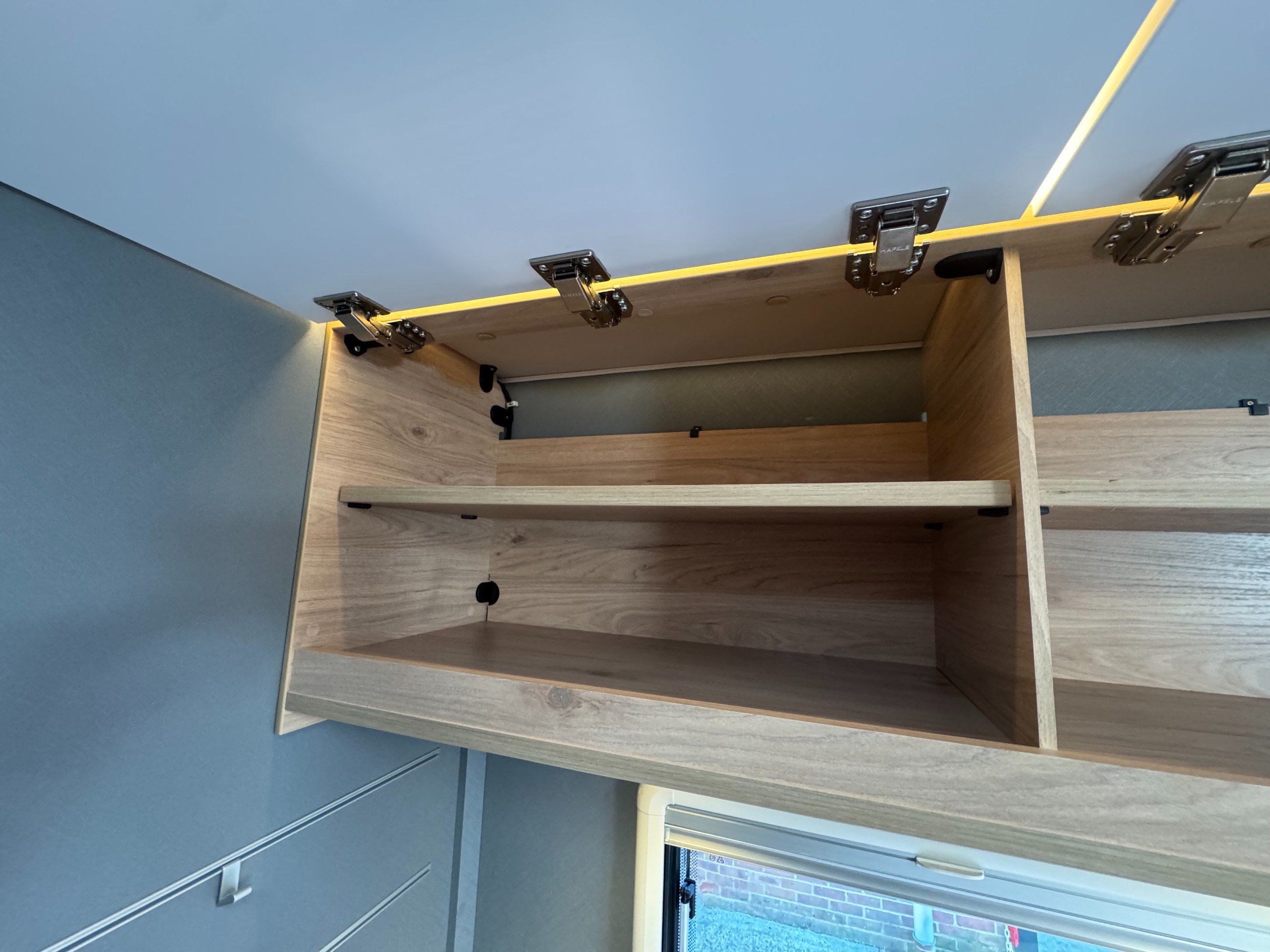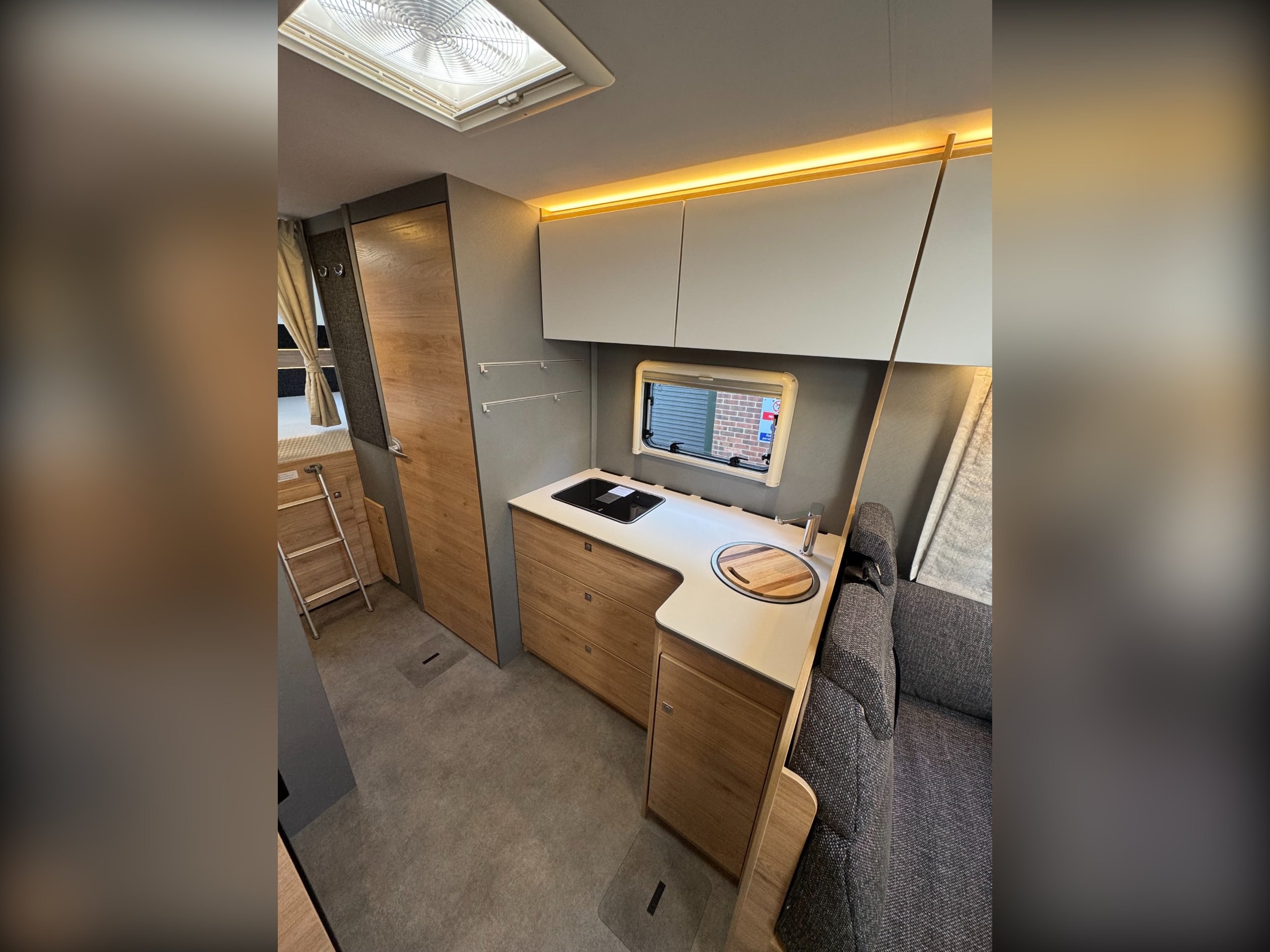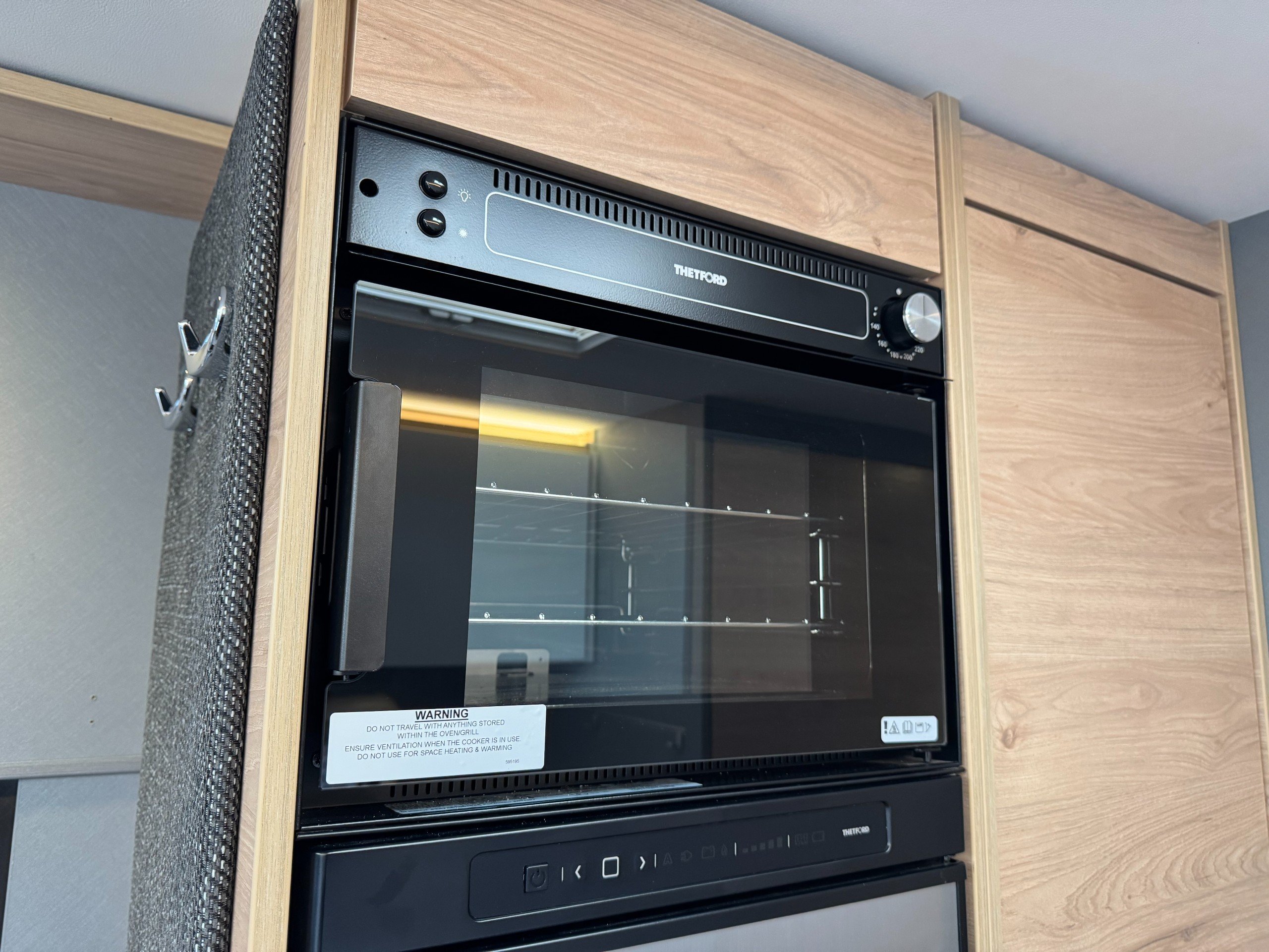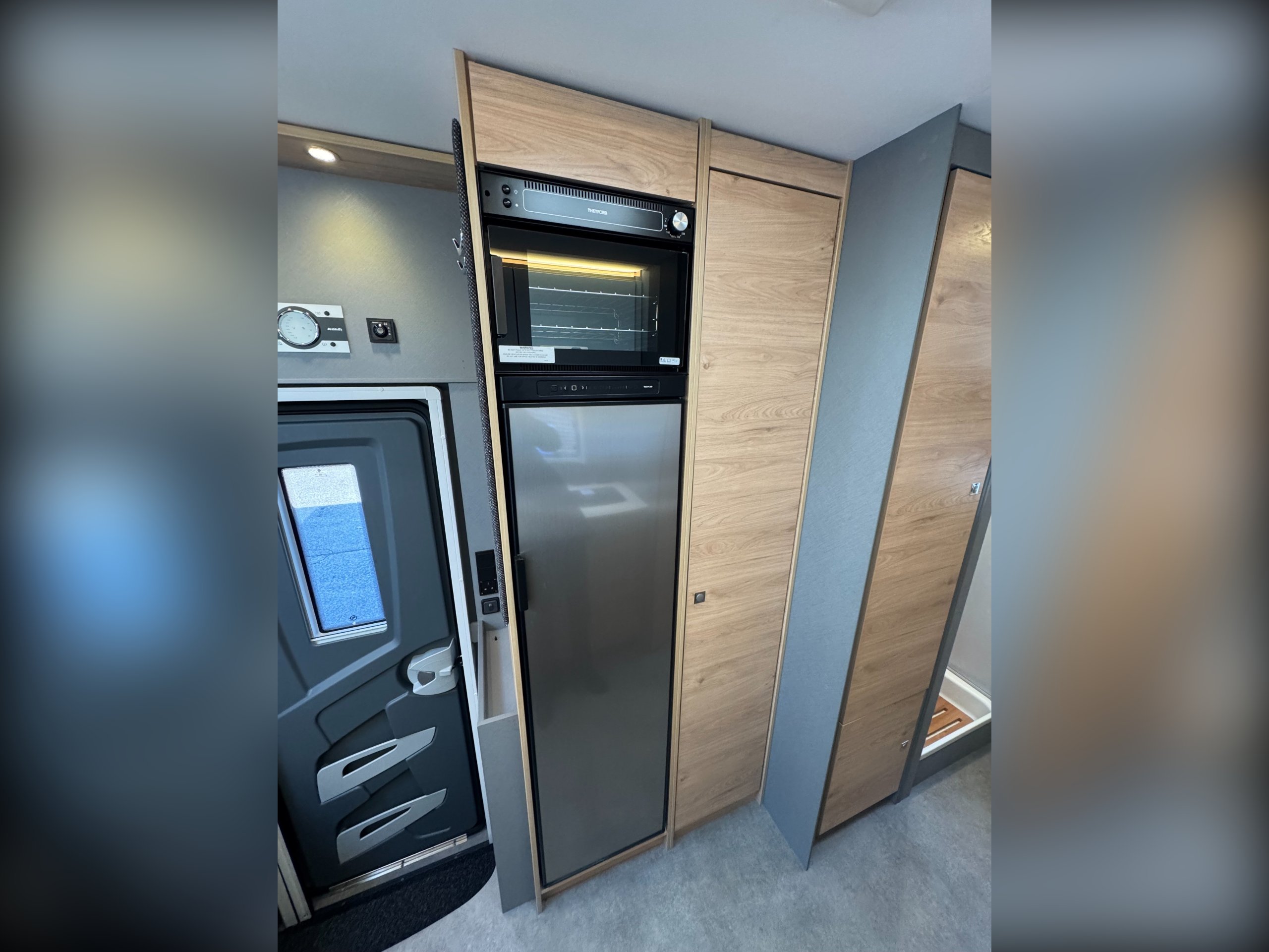 Moving into the kitchen offers, single round bowl sink with mixer tap, 2x burner gas hob with glass lid cover, multiple under counter draw and cupboard, overhead large cupboards, overhead 12v extractor fan, Large Thetford fridge freezer with automatic energy selection option, built in Thetford Gas oven/grill, next to the fridge setup is the first large full height wardrobe with lower shelving.