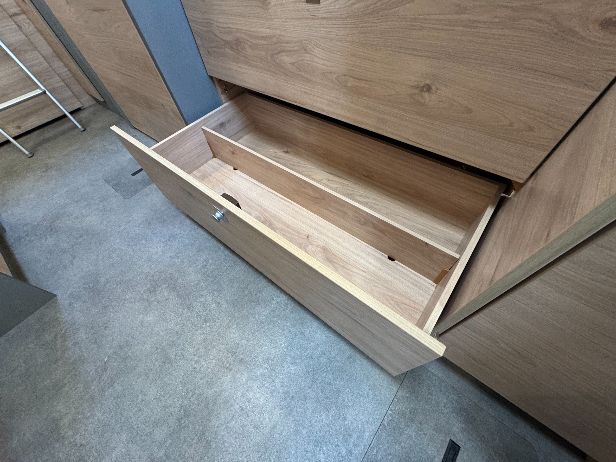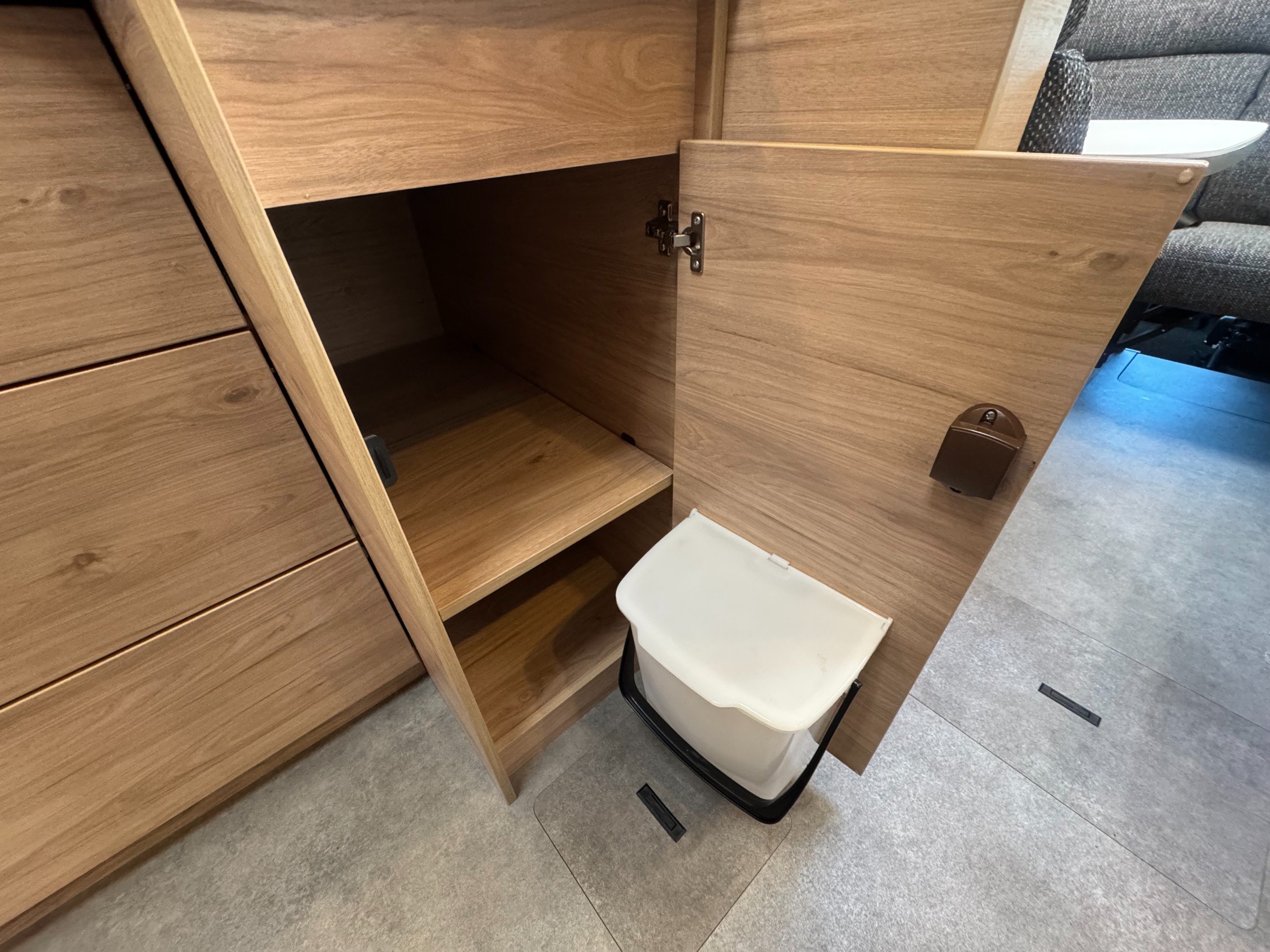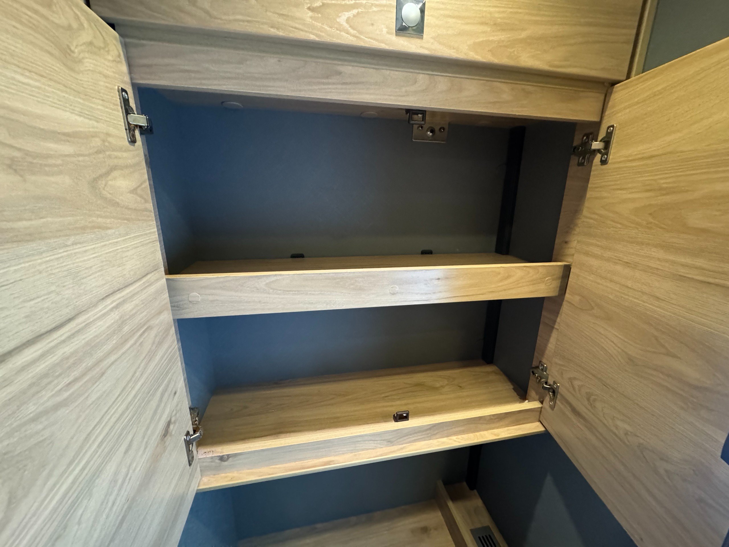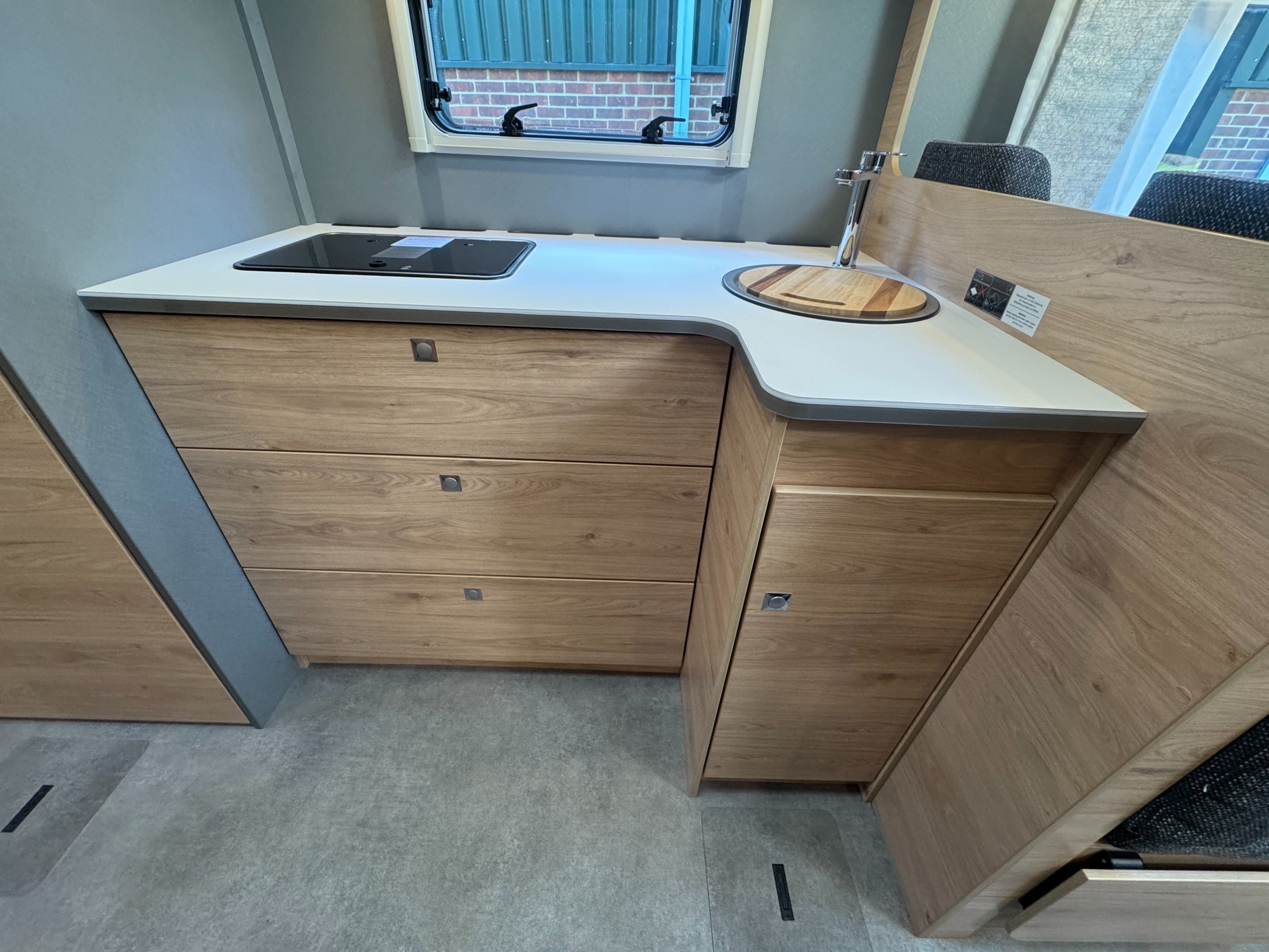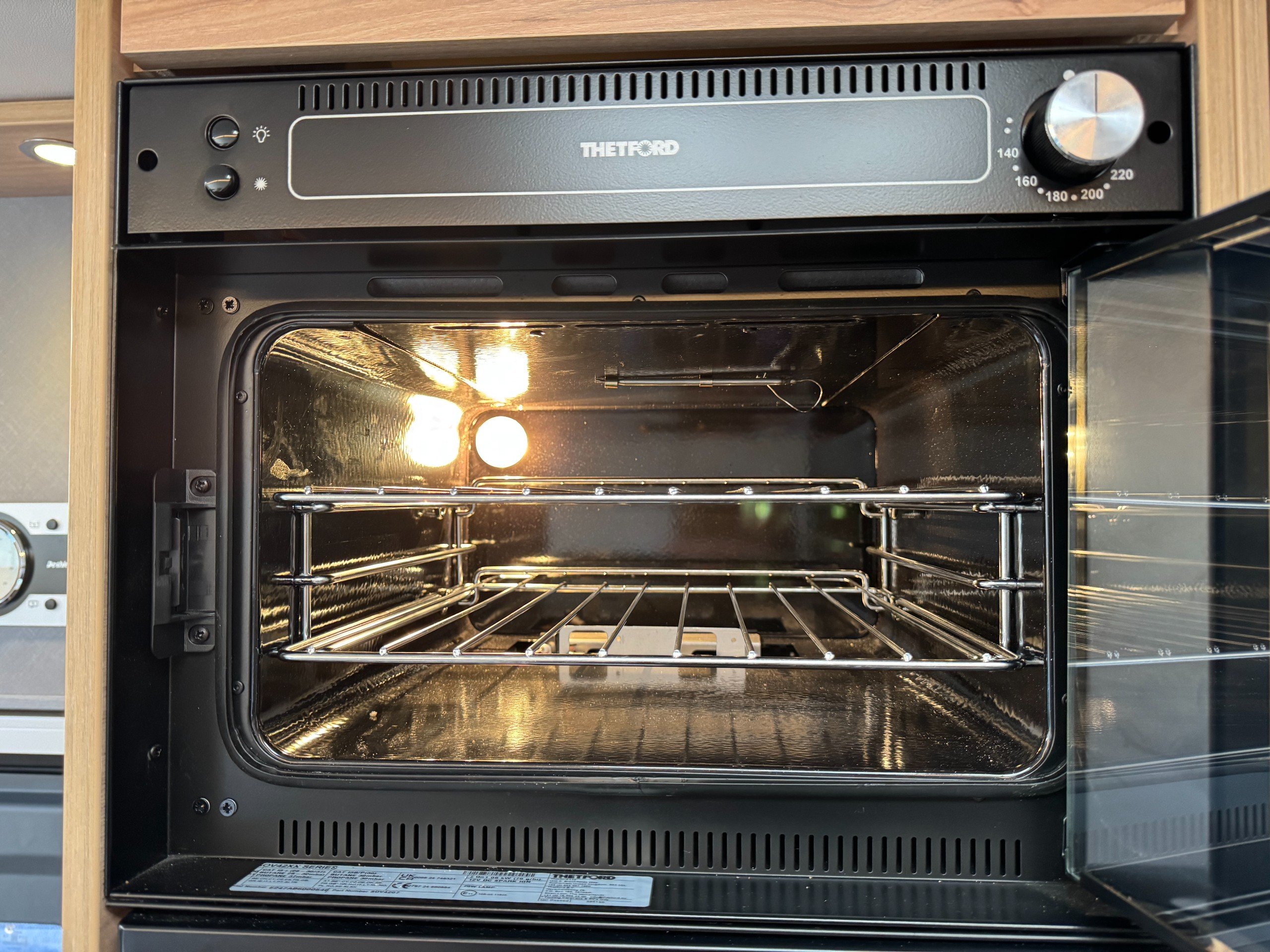 Moving into the kitchen offers, single round bowl sink with mixer tap, 2x burner gas hob with glass lid cover, multiple under counter draw and cupboard, overhead large cupboards, overhead 12v extractor fan, Large Thetford fridge freezer with automatic energy selection option, built in Thetford Gas oven/grill, next to the fridge setup is the first large full height wardrobe with lower shelving.