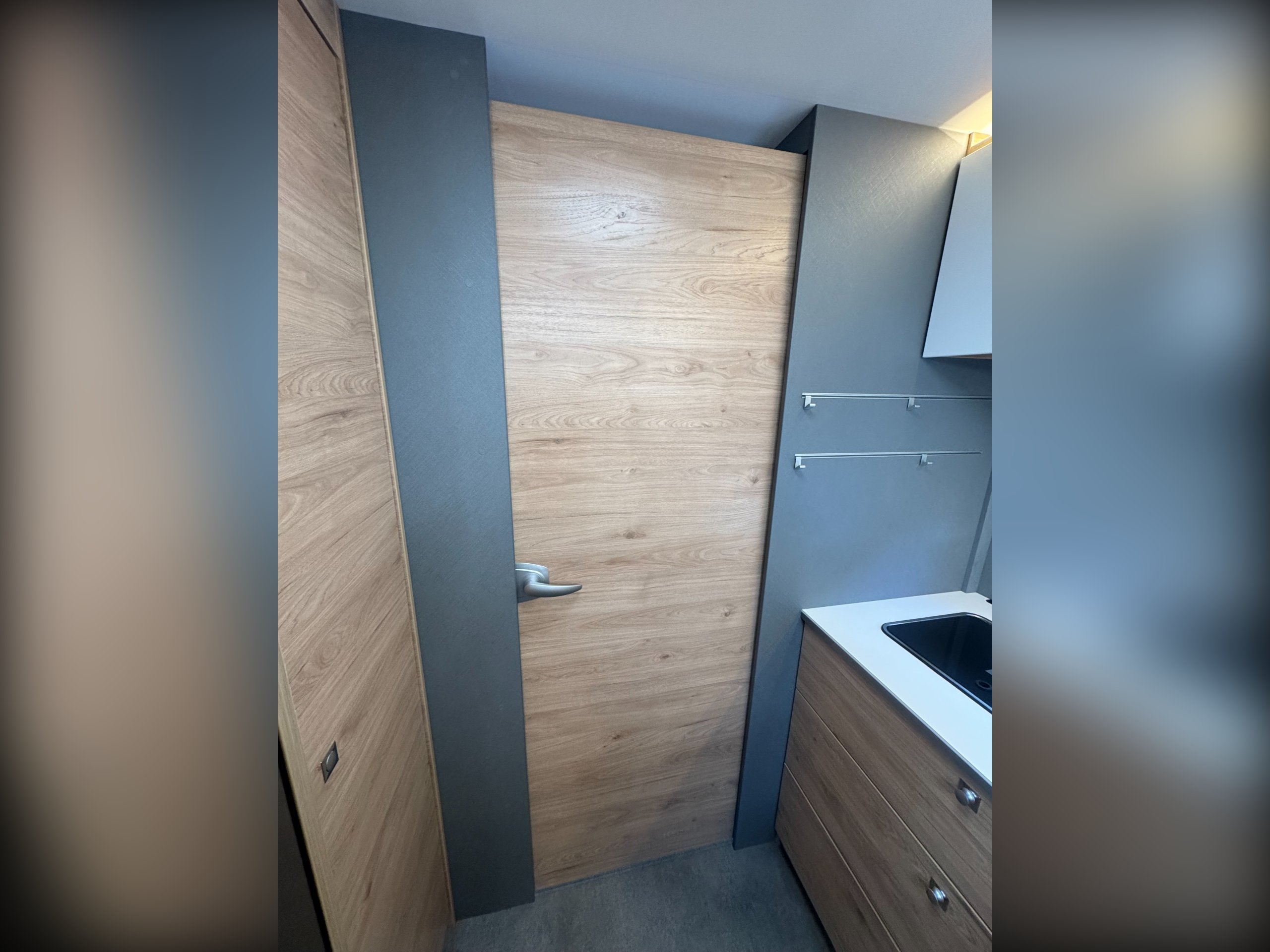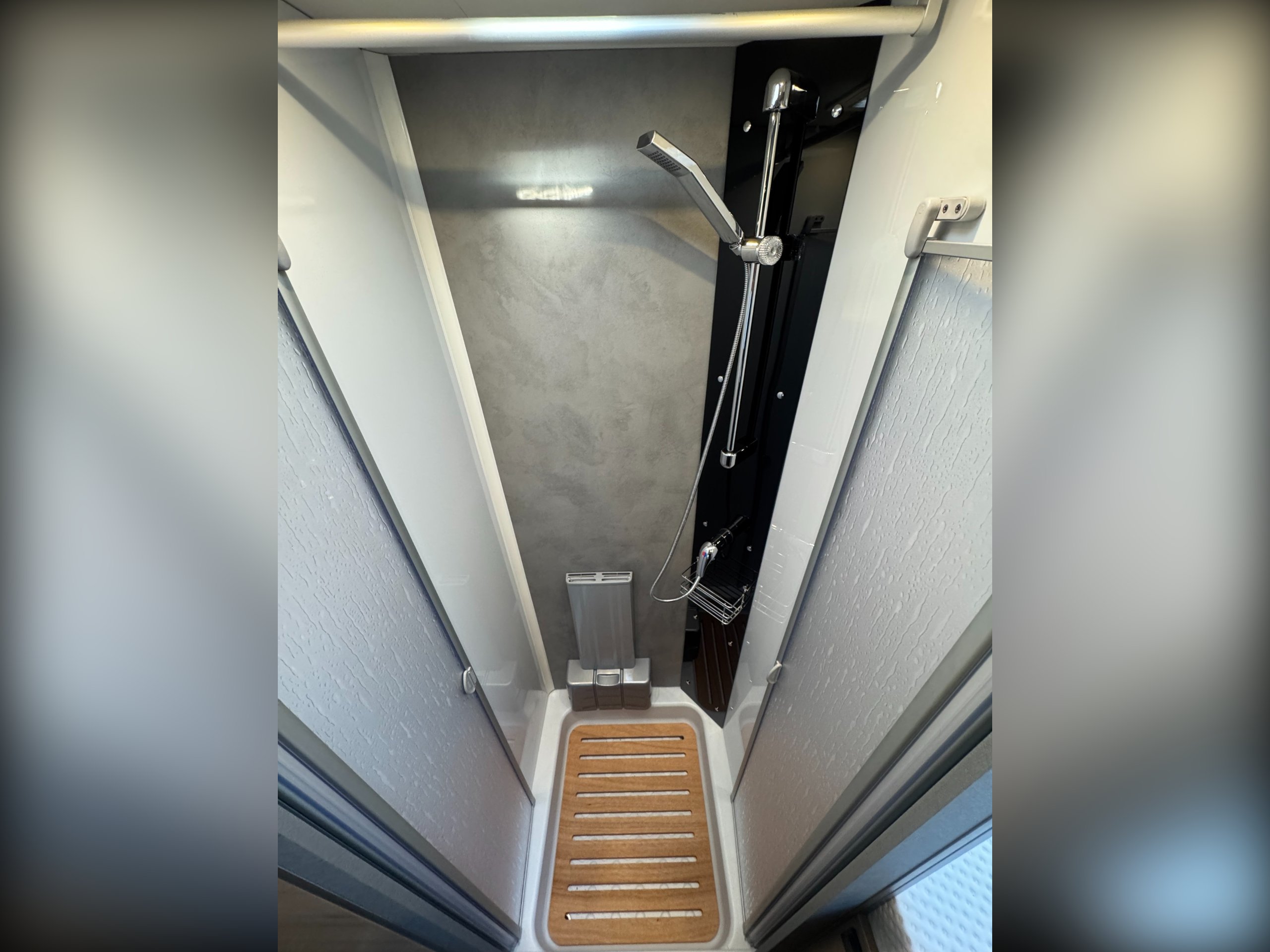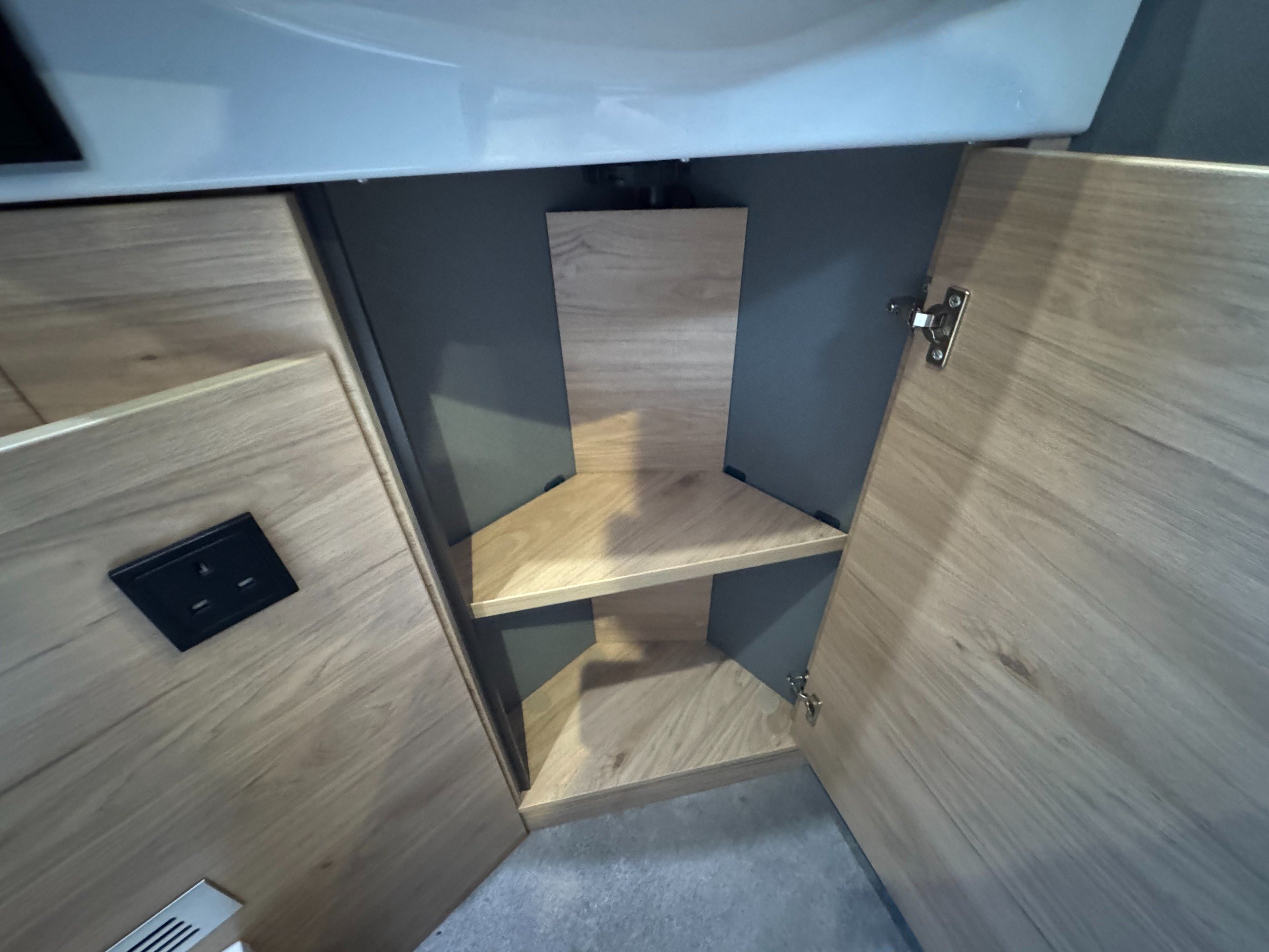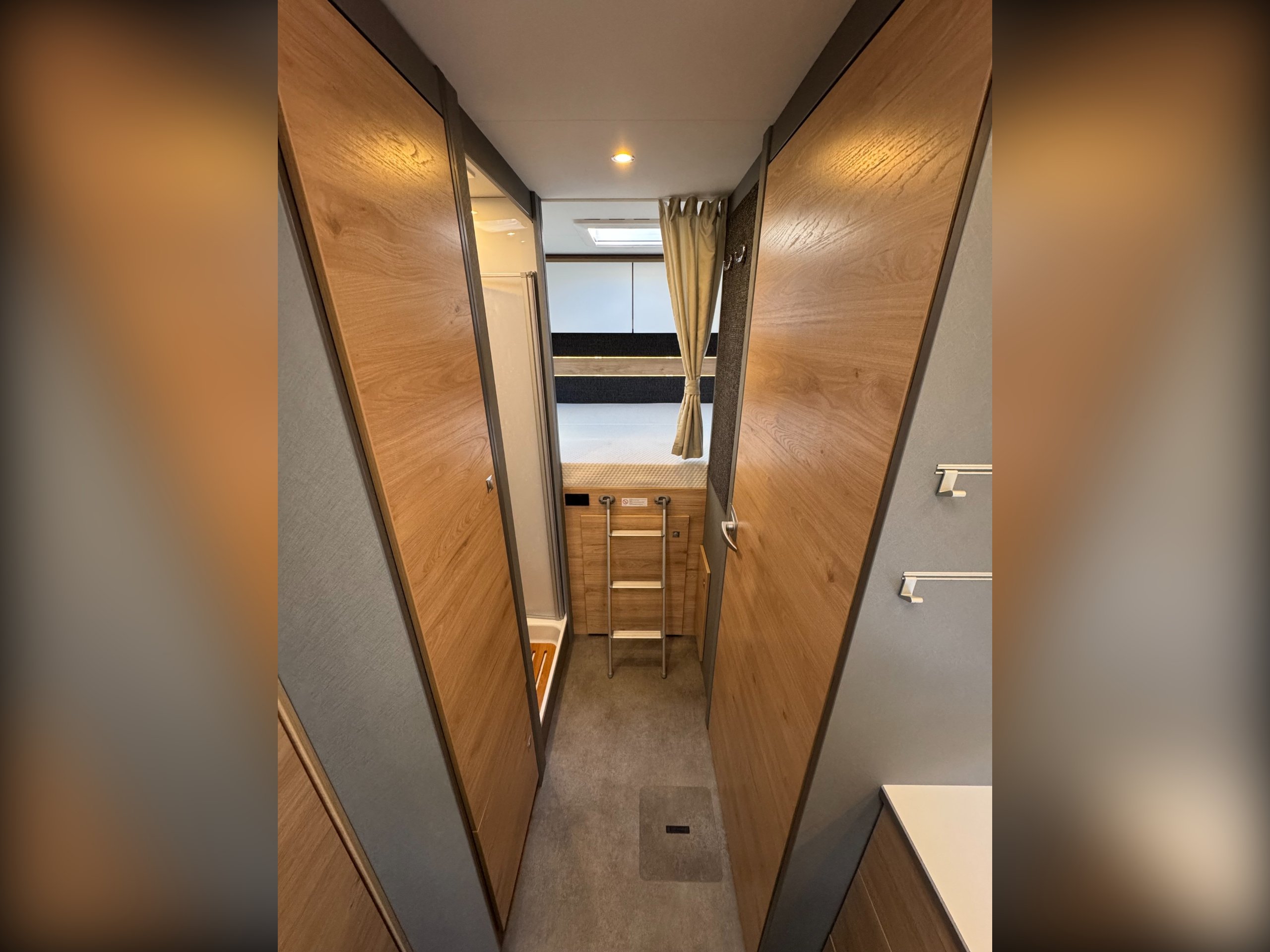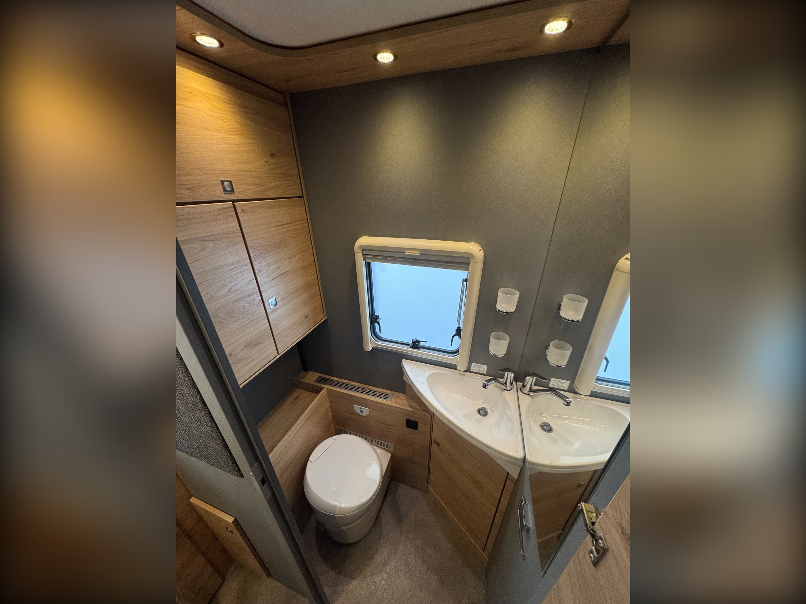 Moving down the motorhome is the second full height wardrobe, separate large shower cubicle, wooden shower platform, with glass screen door divide and roof light, separate washroom with single corner bowl sink, under sink storage, Thetford electric flush toilet, overhead storage cupboards, wall vanity mirror, side window.