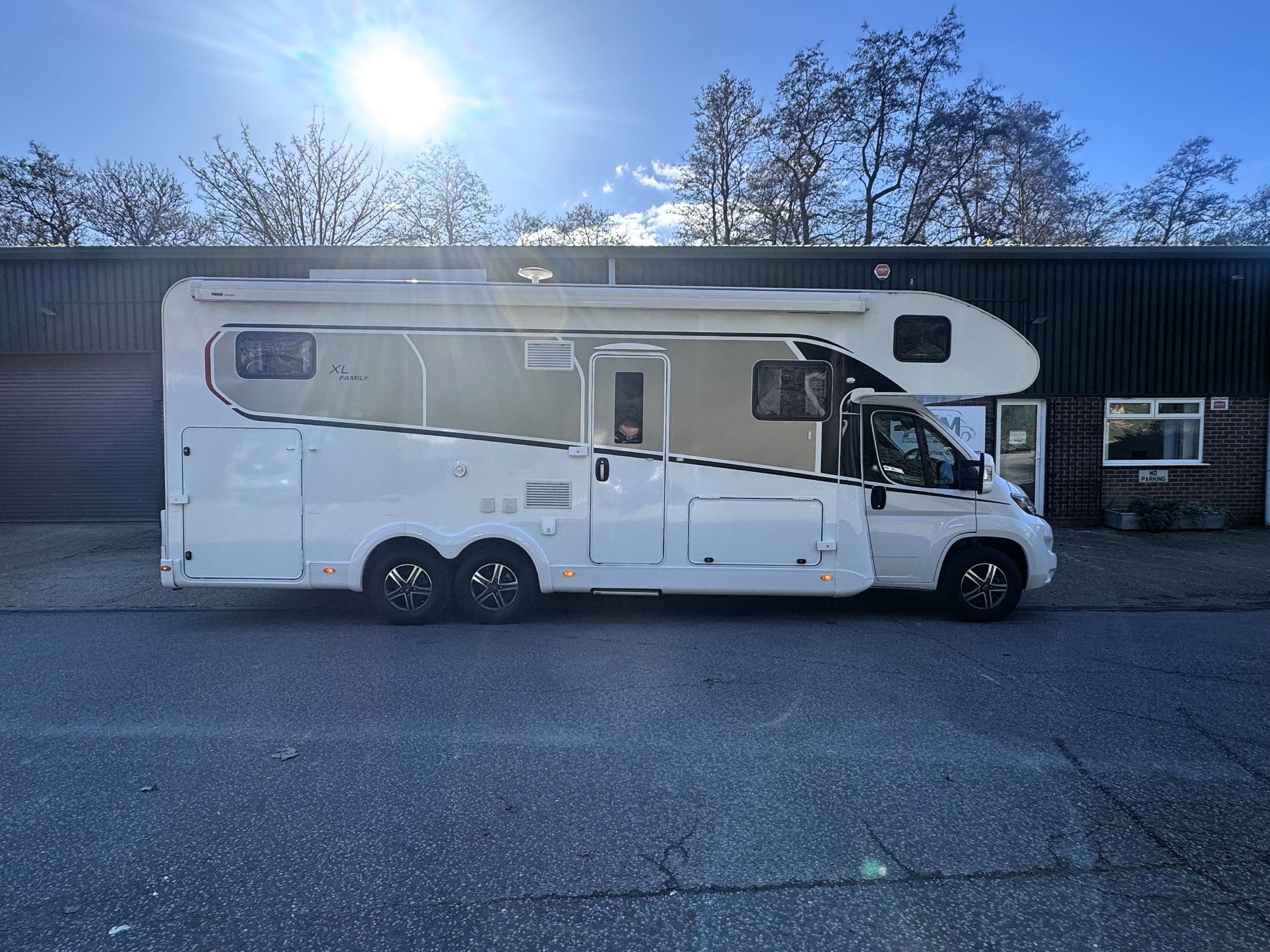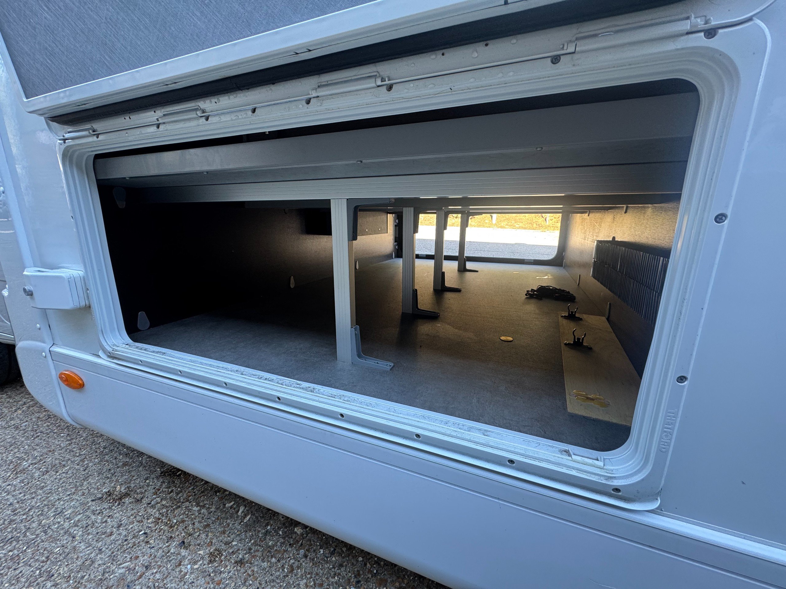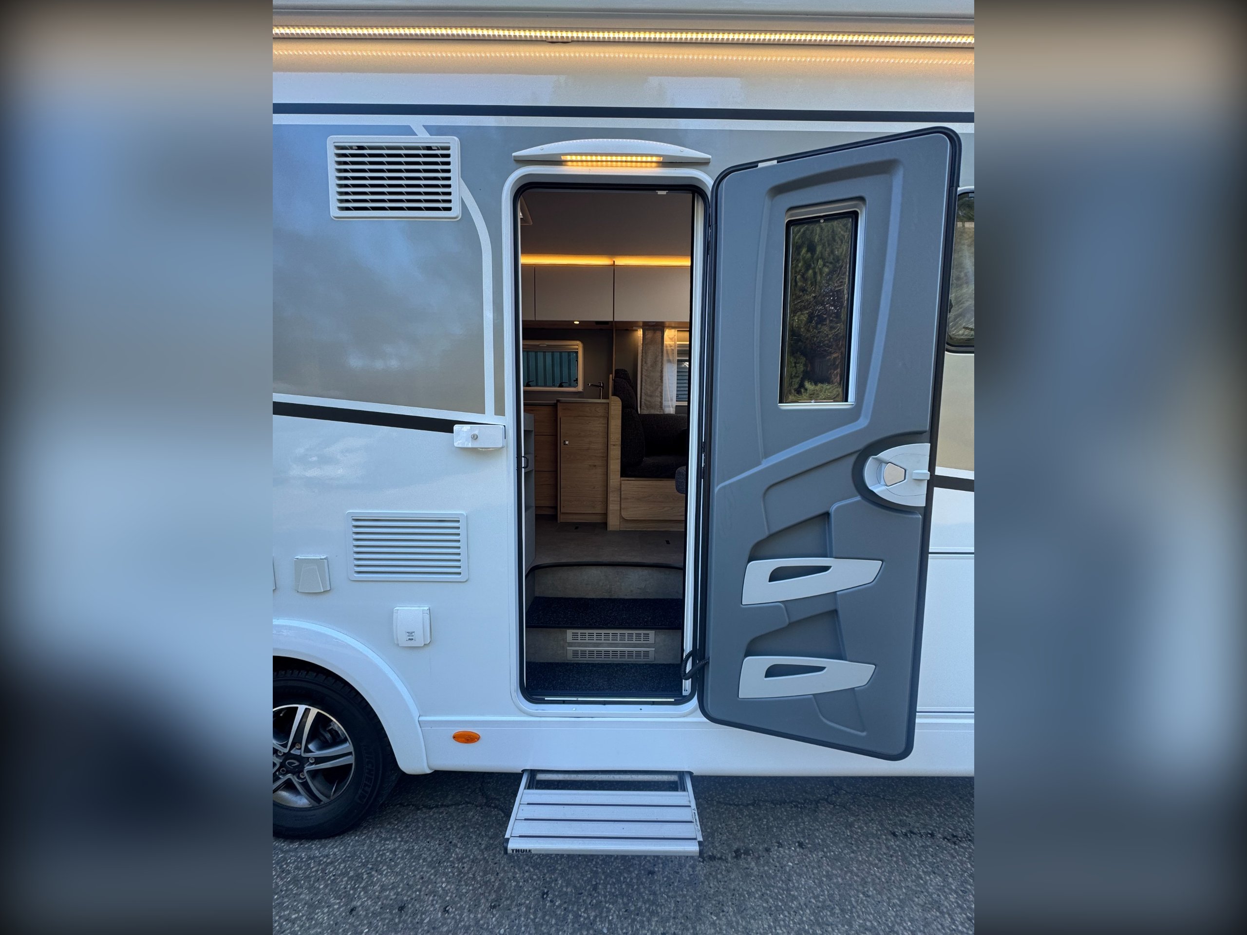Exterior of the motorhome features, 16" alloy wheels, Thule Omnistor awning with LED strip light, External shower point, External 240v socket, External BBQ point, Massive rear garage, heated rear garage, under floor through belly locker with double door access, gas locker with space for 2x 13kg bottle (Gaslow available on request), roof mounted solar panel, LED DRL lights, Mirror covers, Thule security locker locks to all lockers, Reverse camera mounted and pre wired for screen options to cab. Digital roof mounted aerial,