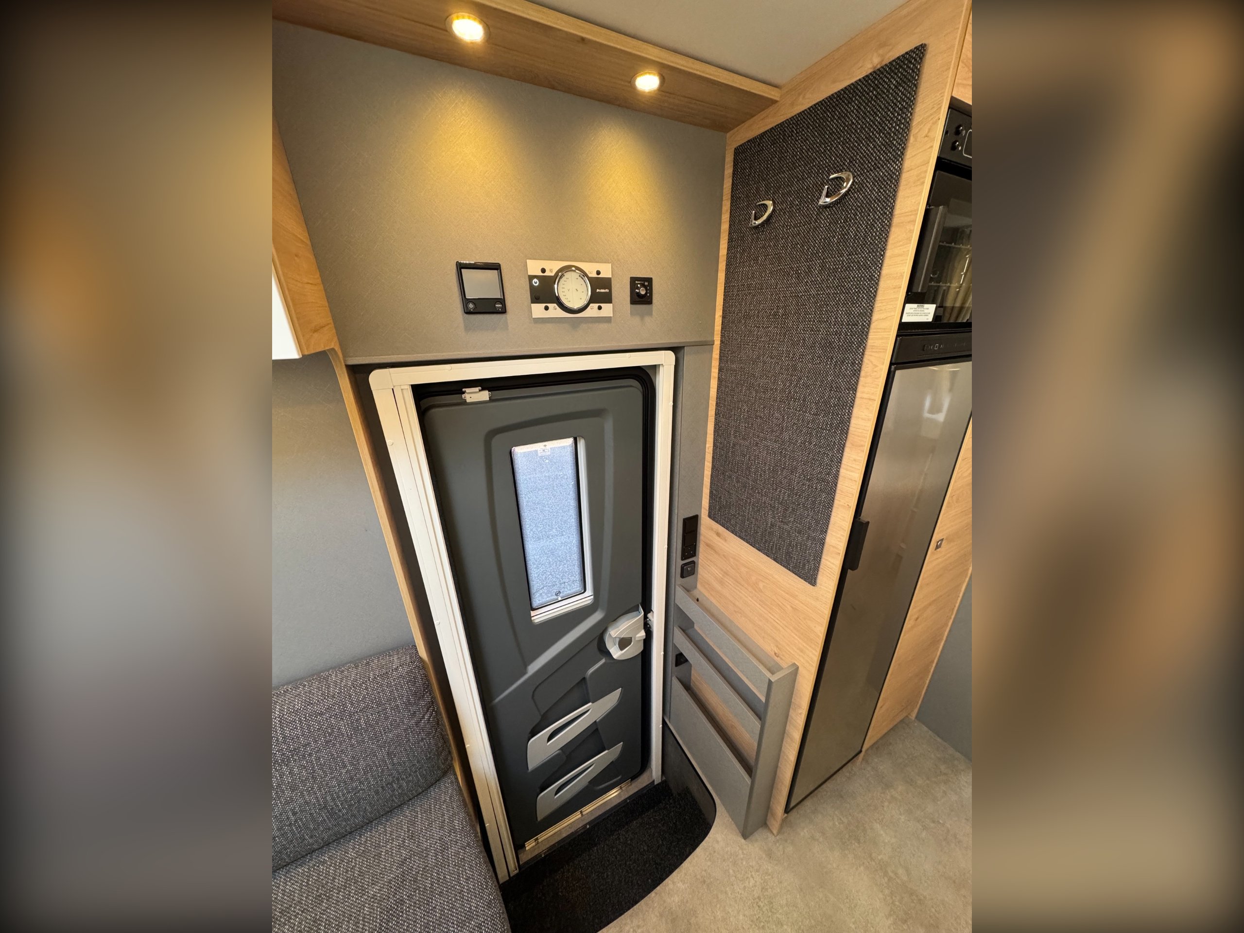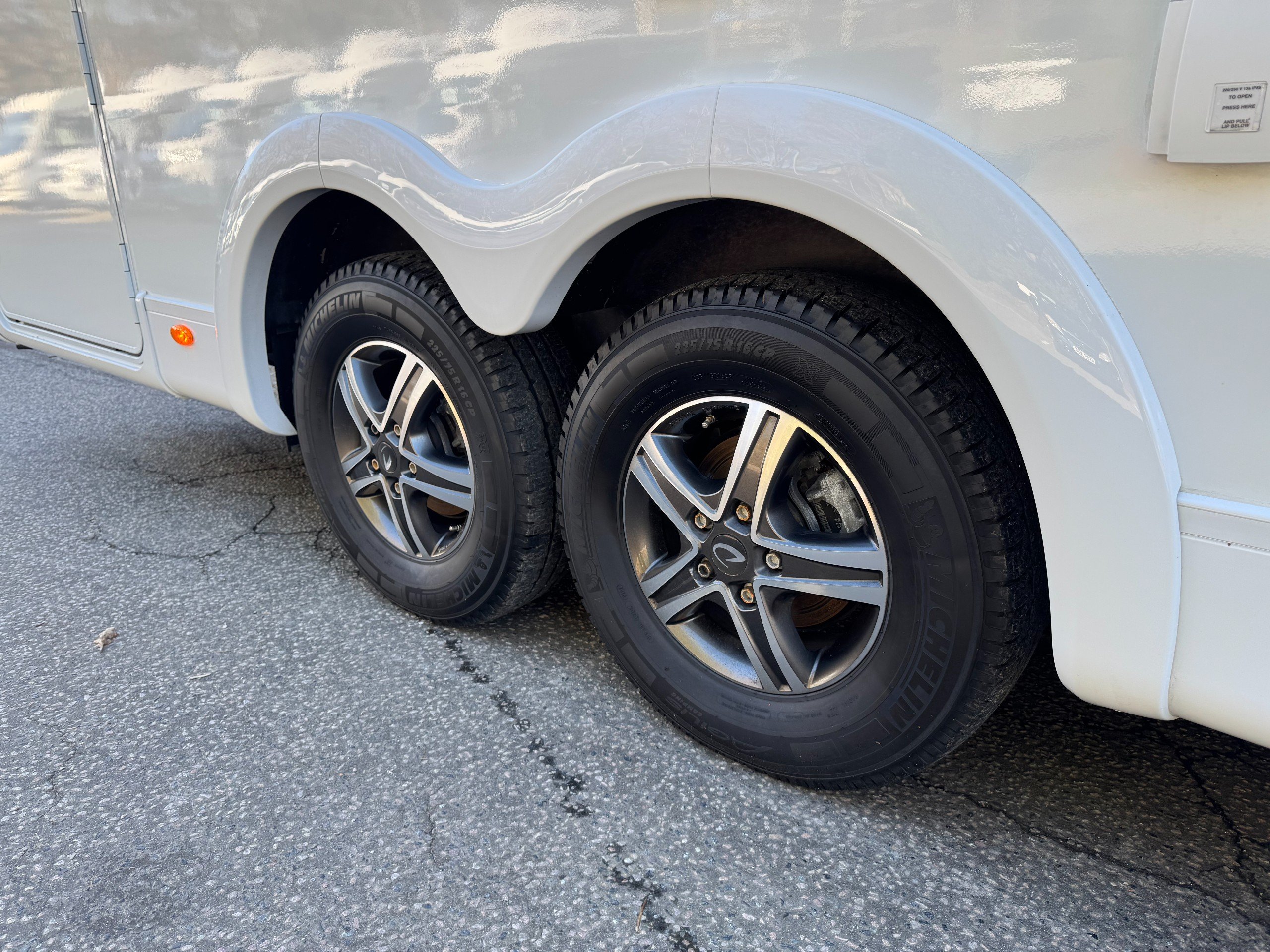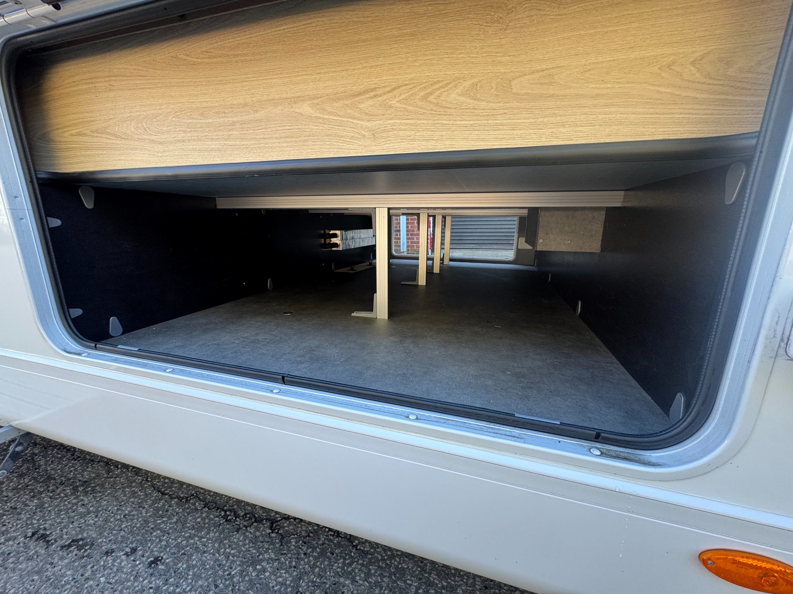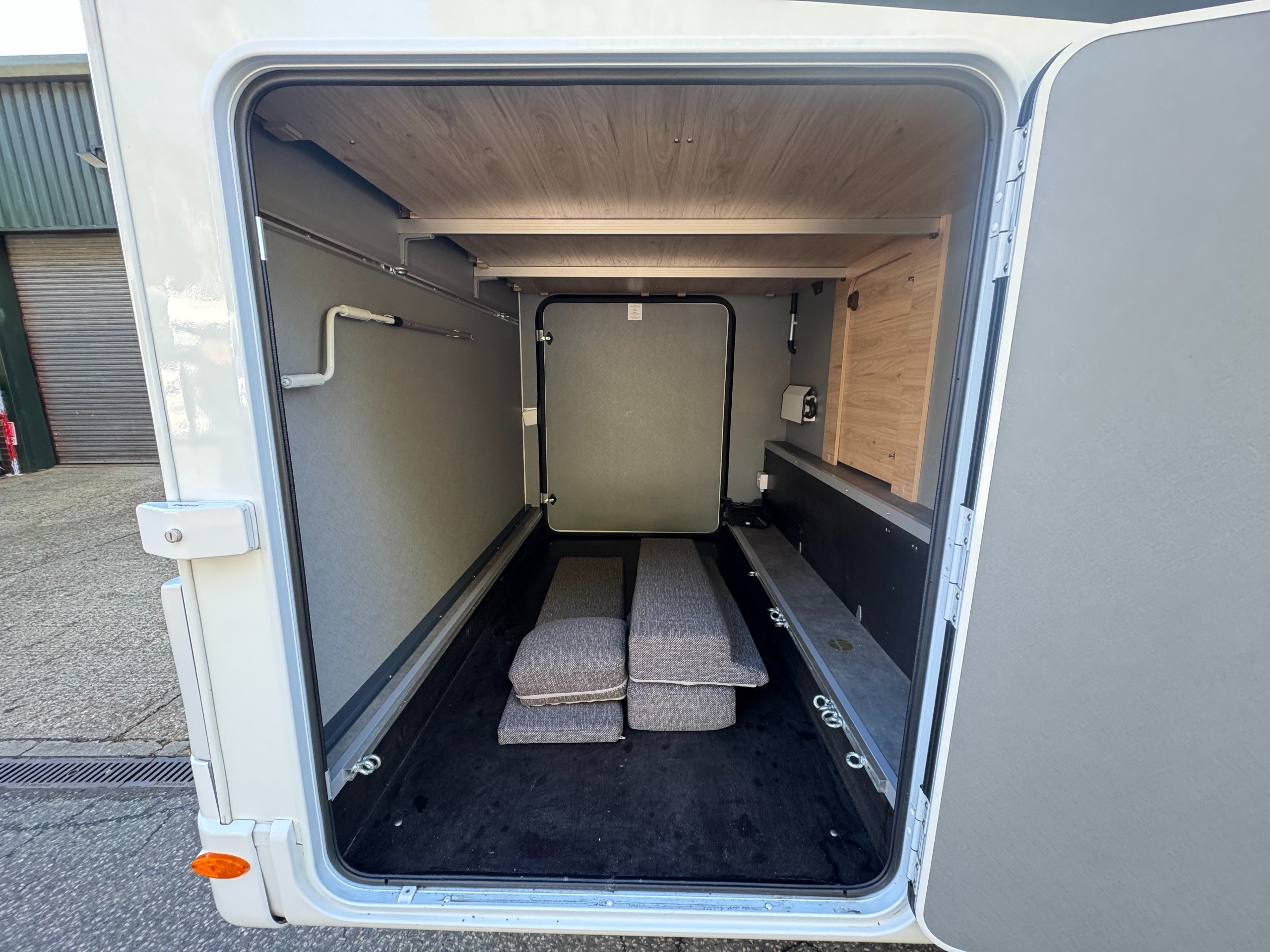 Exterior of the motorhome features, 16" alloy wheels, Thule Omnistor awning with LED strip light, External shower point, External 240v socket, External BBQ point, Massive rear garage, heated rear garage, under floor through belly locker with double door access, gas locker with space for 2x 13kg bottle (Gaslow available on request), roof mounted solar panel, LED DRL lights, Mirror covers, Thule security locker locks to all lockers, Reverse camera mounted and pre wired for screen options to cab. Digital roof mounted aerial,