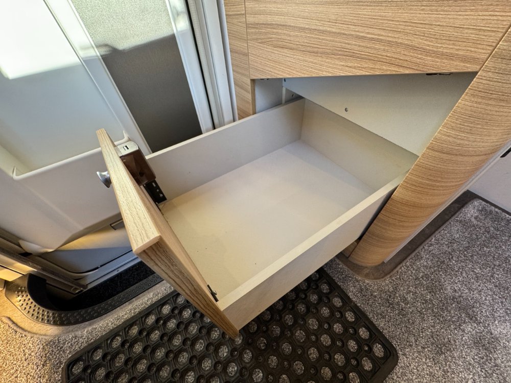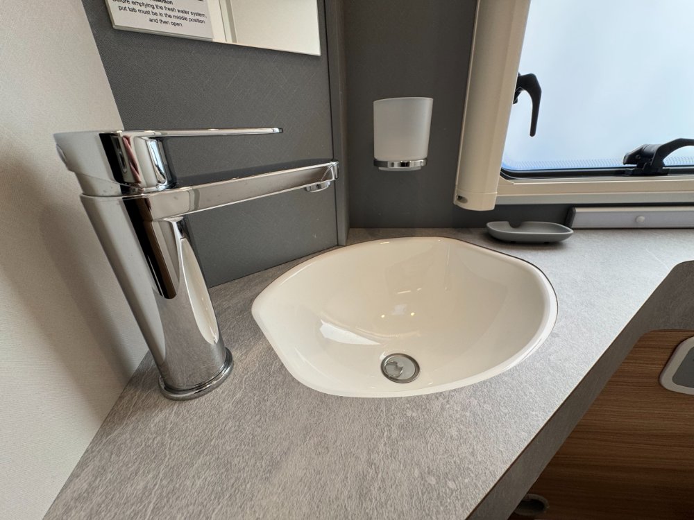 The washroom benefits with ample storage and Thetford toilet with electric flush. Single bowl sink with chrome mixer tap. Opposite in hallway is the separate shower with double door glass screen.