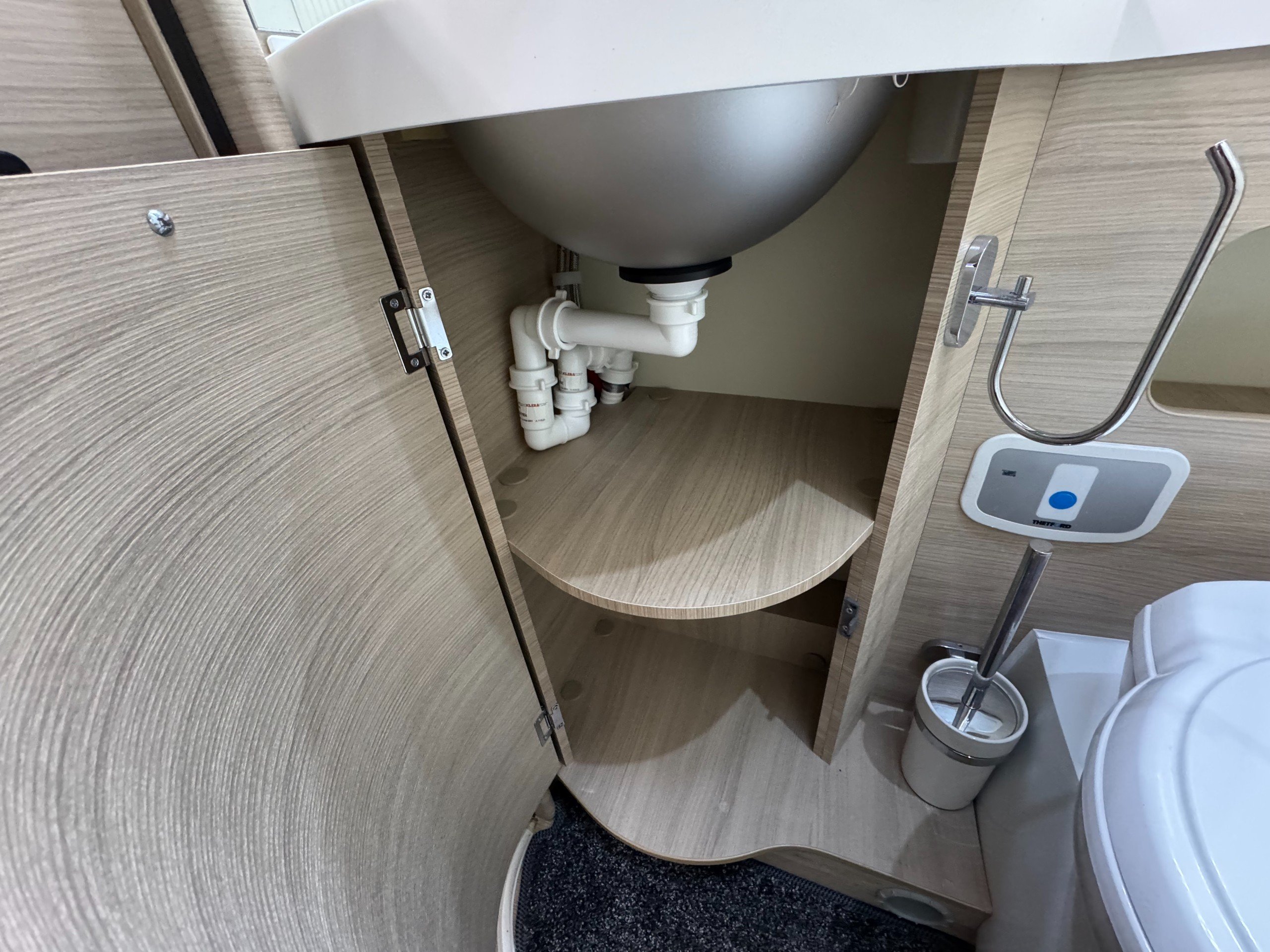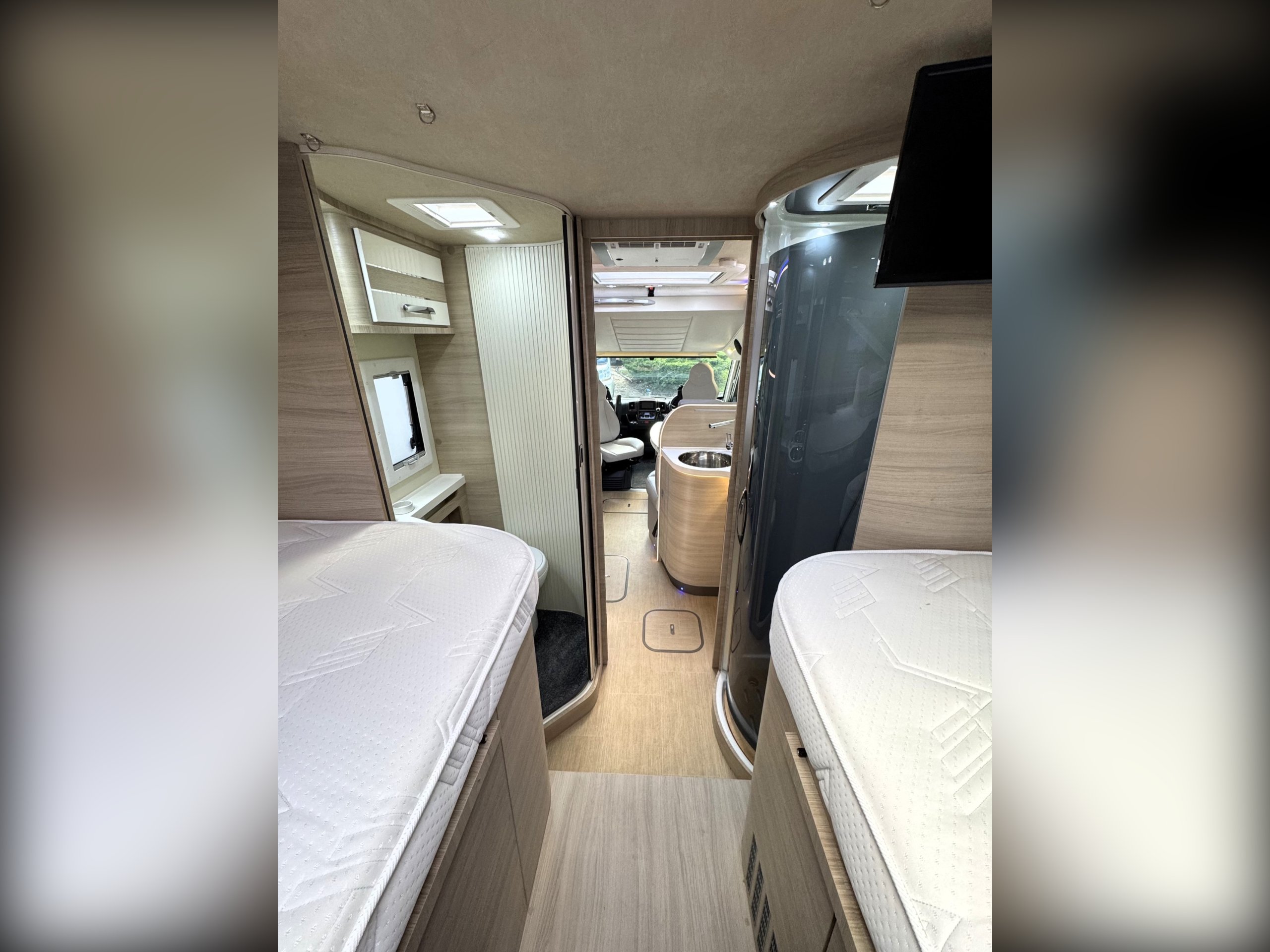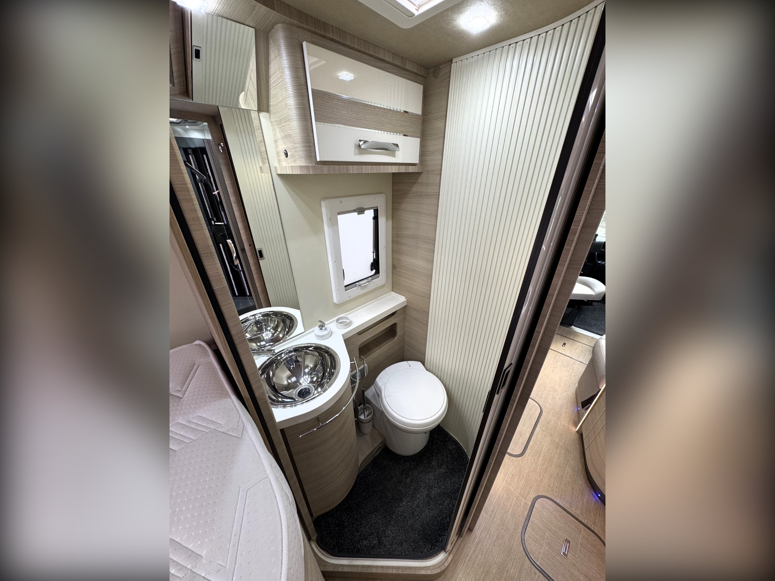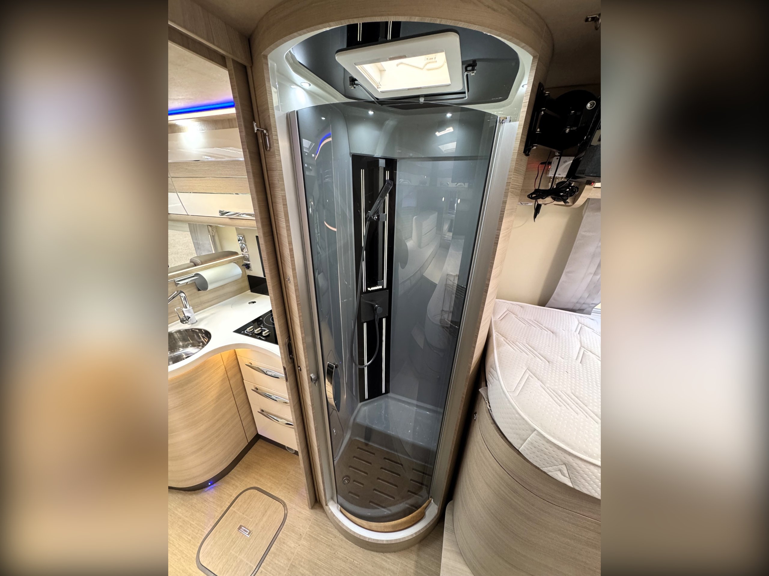 Moving into the rear of the motorhome offers door slide divide, Separate spacious shower cubicle with glass door divide, separate washroom with Thetford electric flush toilet, Chrome round bowl sink with mixer tap, large vanity mirrors, overhead and under sink cupboards.