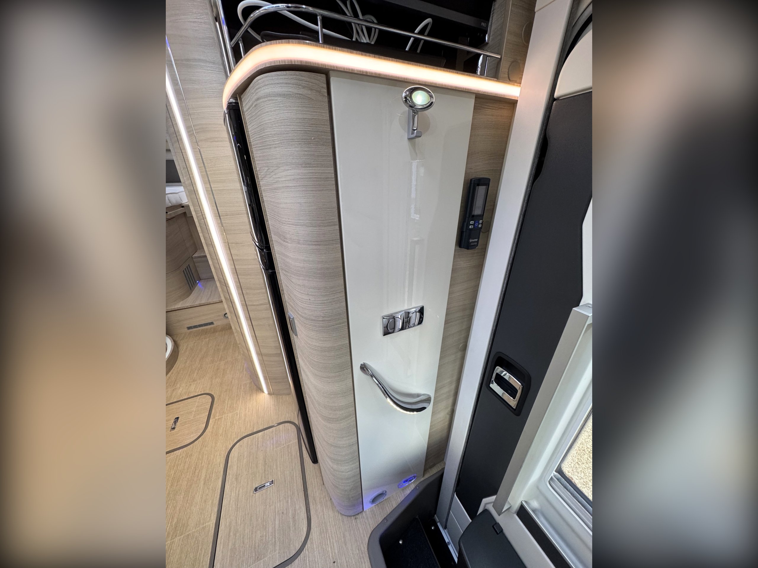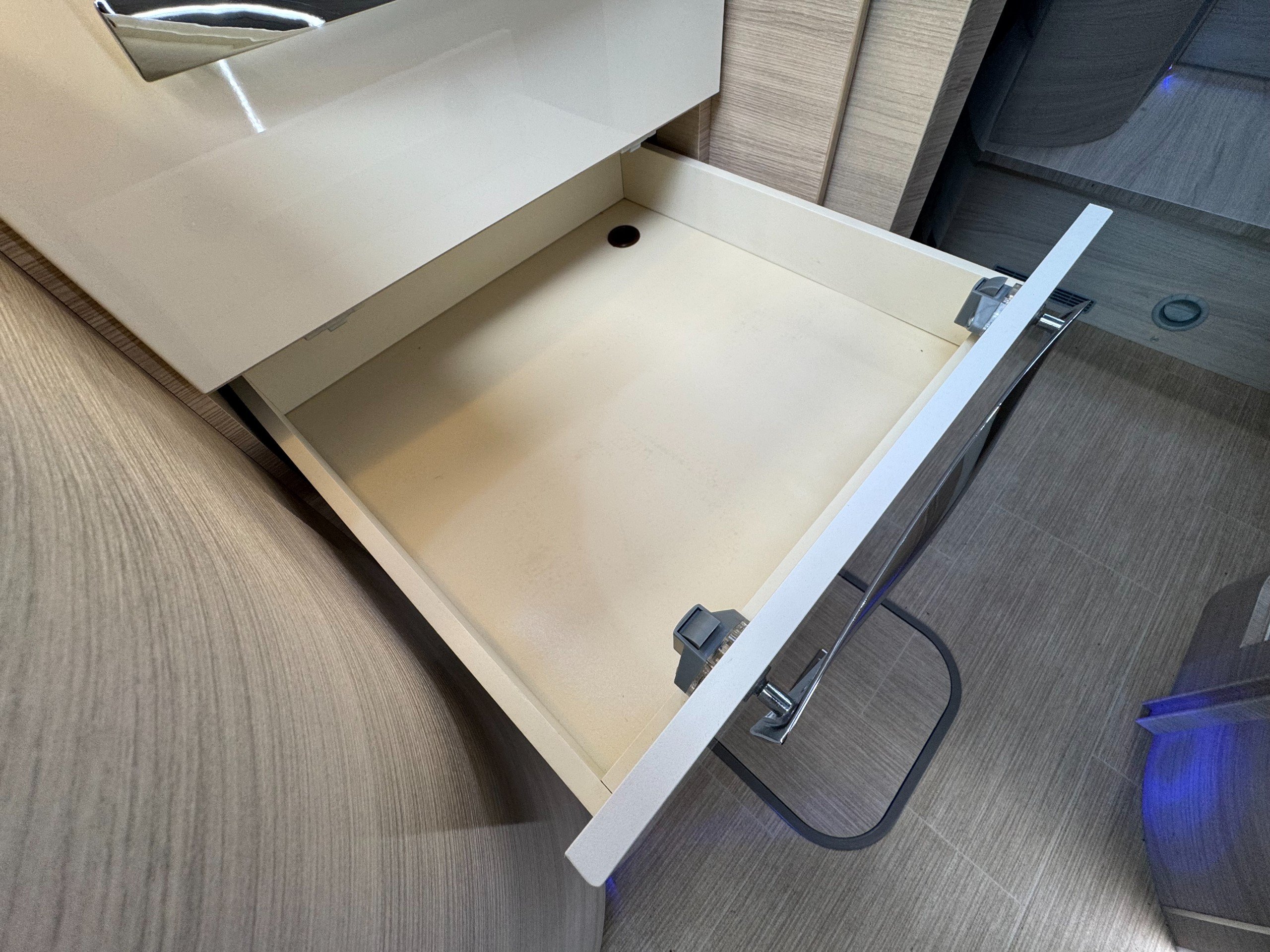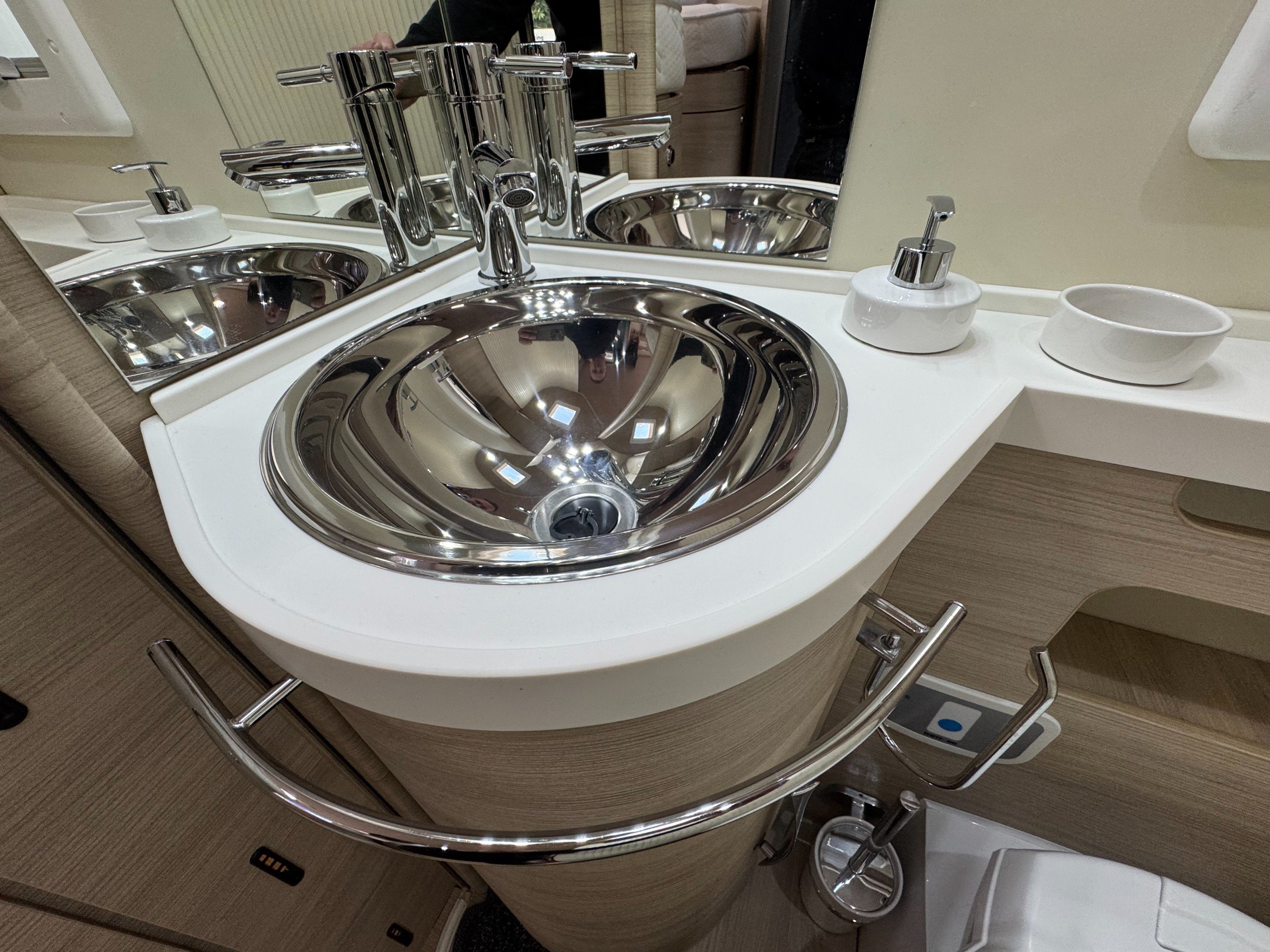 Moving into the rear of the motorhome offers door slide divide, Separate spacious shower cubicle with glass door divide, separate washroom with Thetford electric flush toilet, Chrome round bowl sink with mixer tap, large vanity mirrors, overhead and under sink cupboards.