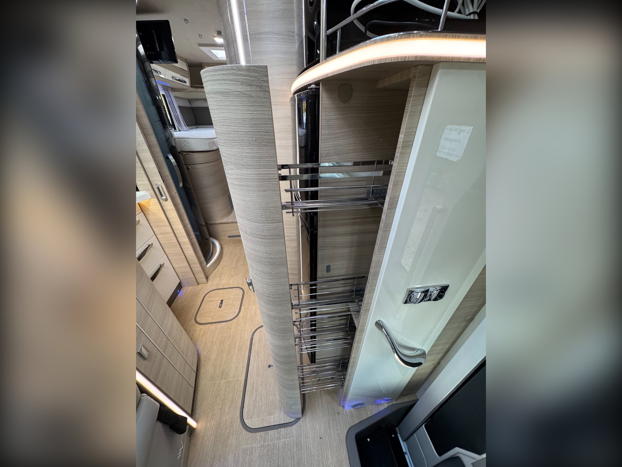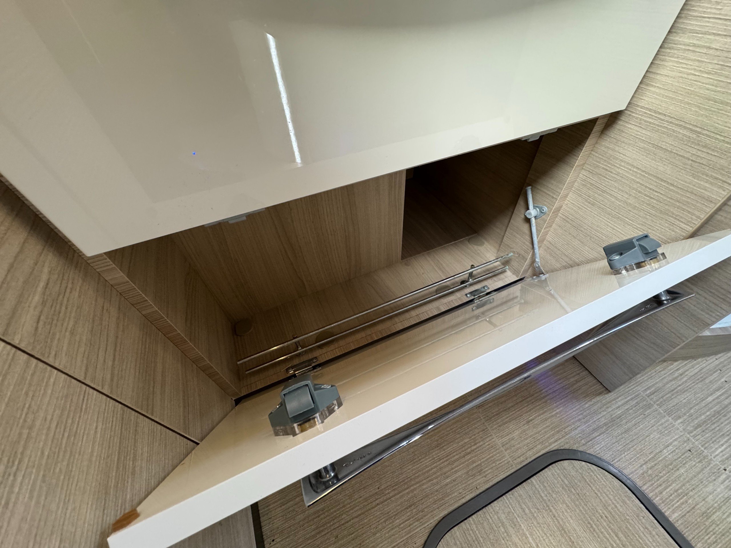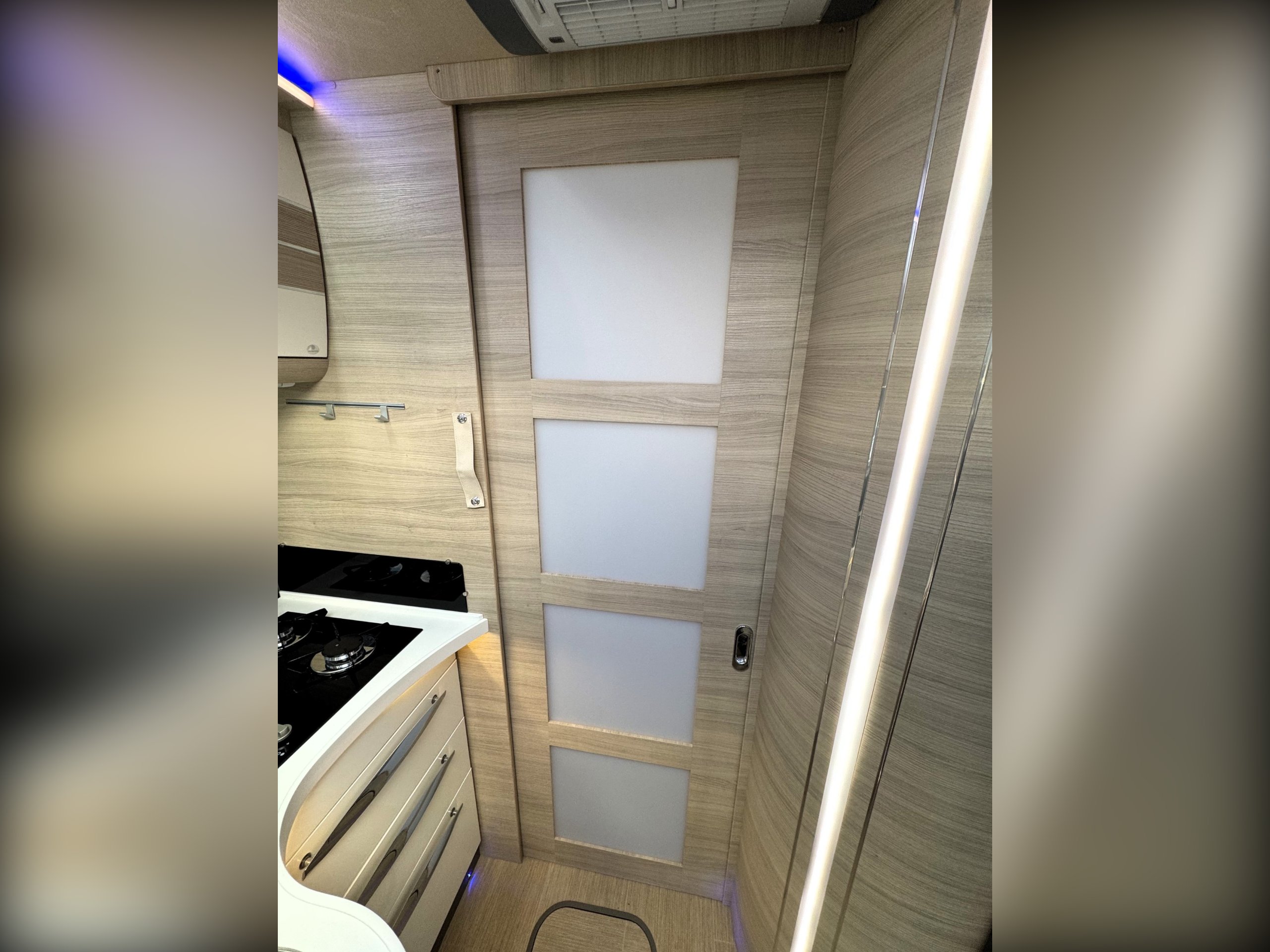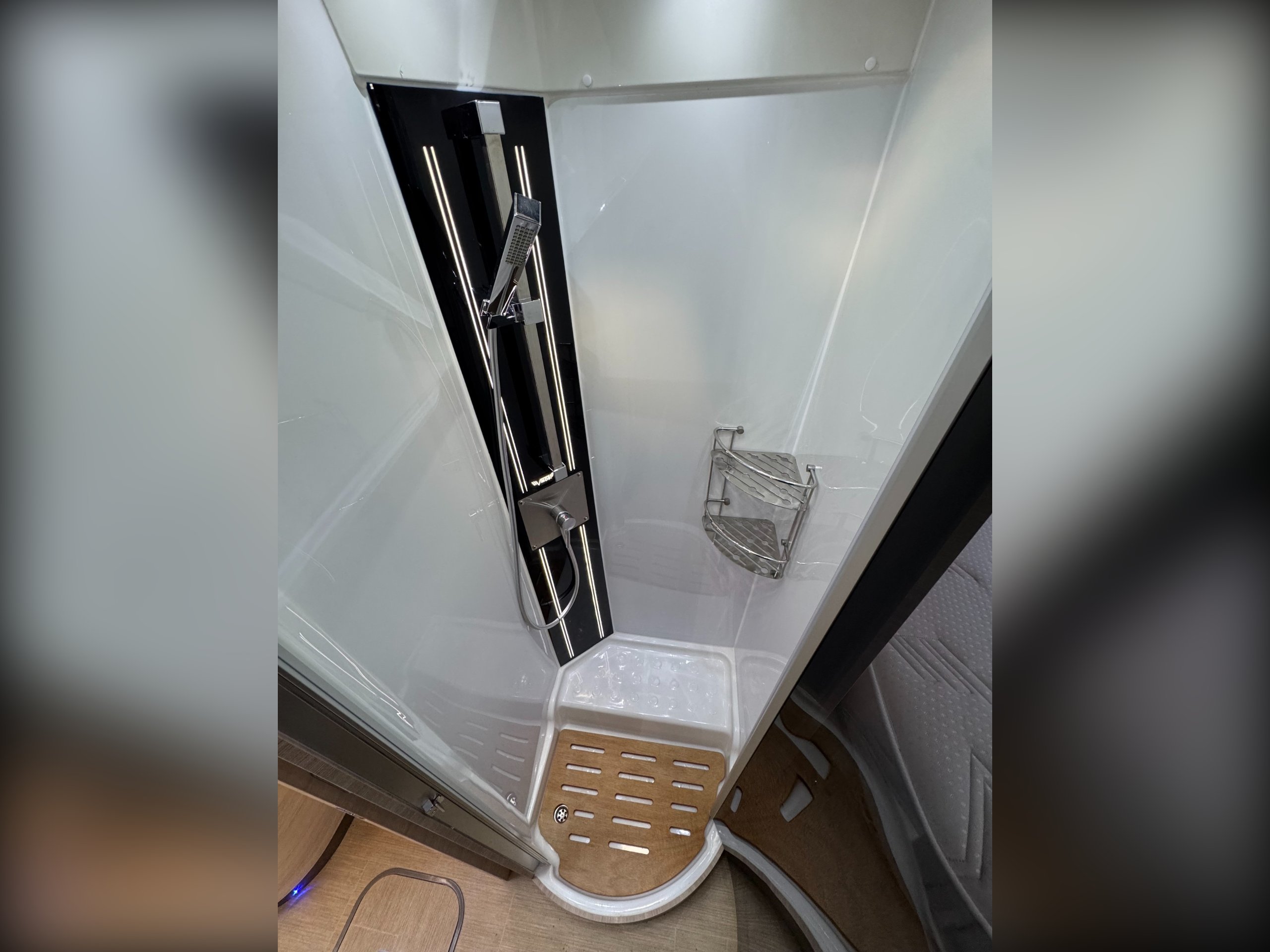 Moving into the rear of the motorhome offers door slide divide, Separate spacious shower cubicle with glass door divide, separate washroom with Thetford electric flush toilet, Chrome round bowl sink with mixer tap, large vanity mirrors, overhead and under sink cupboards.
