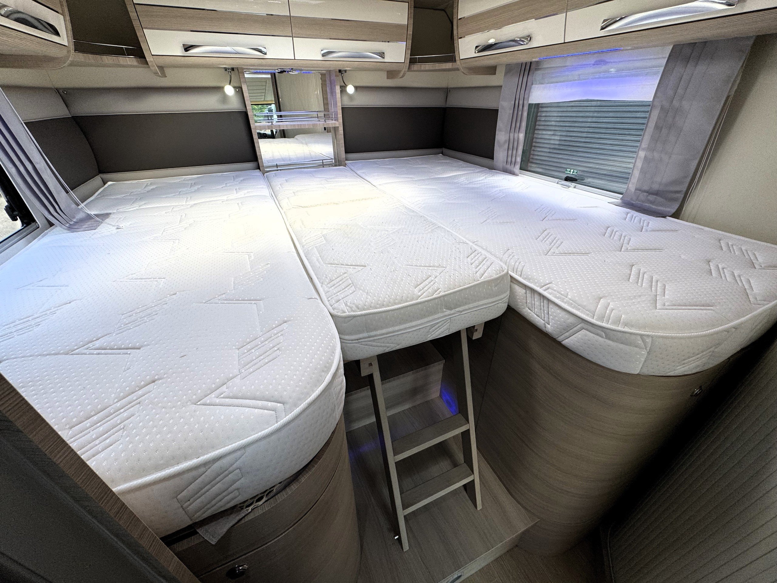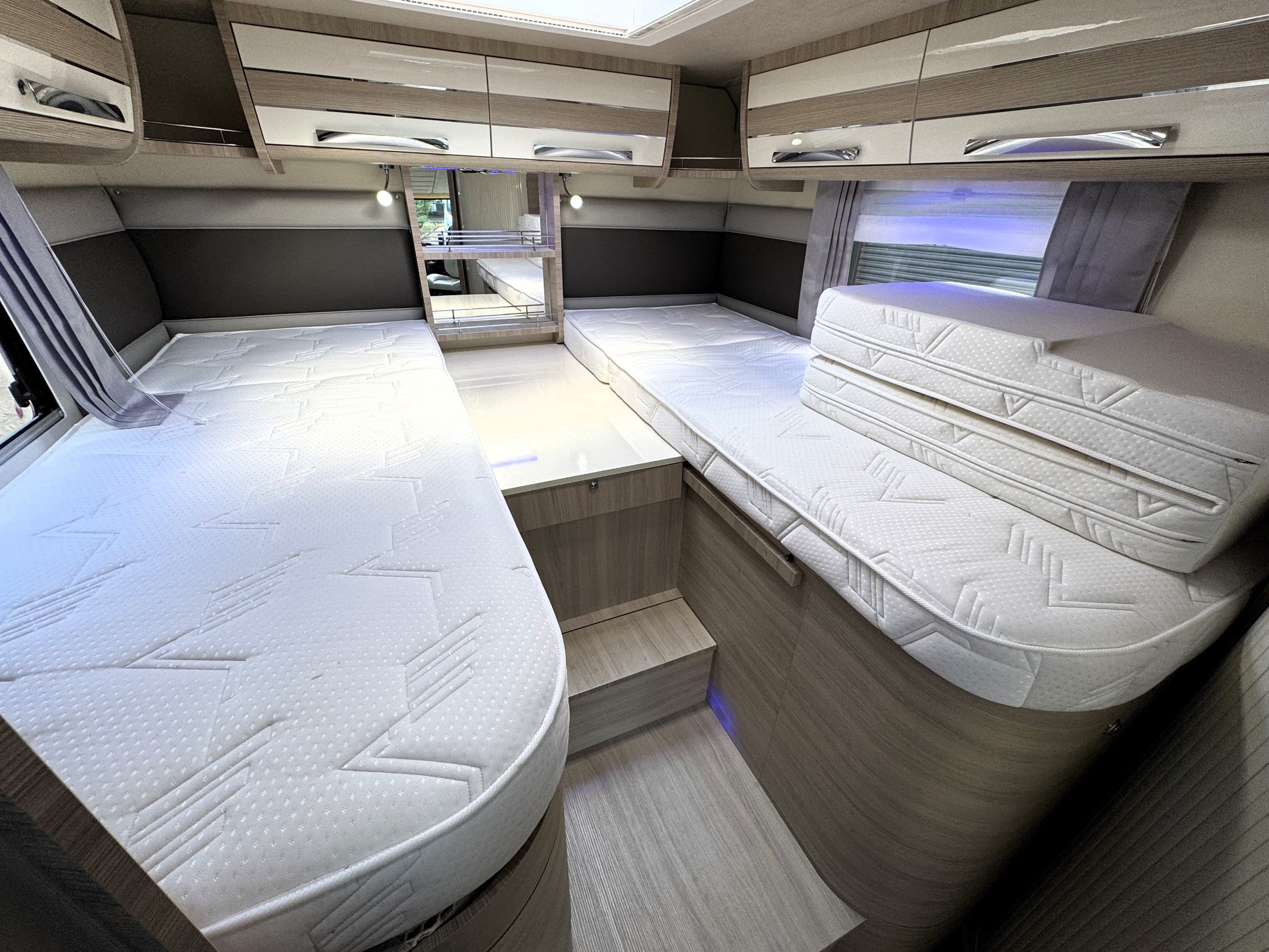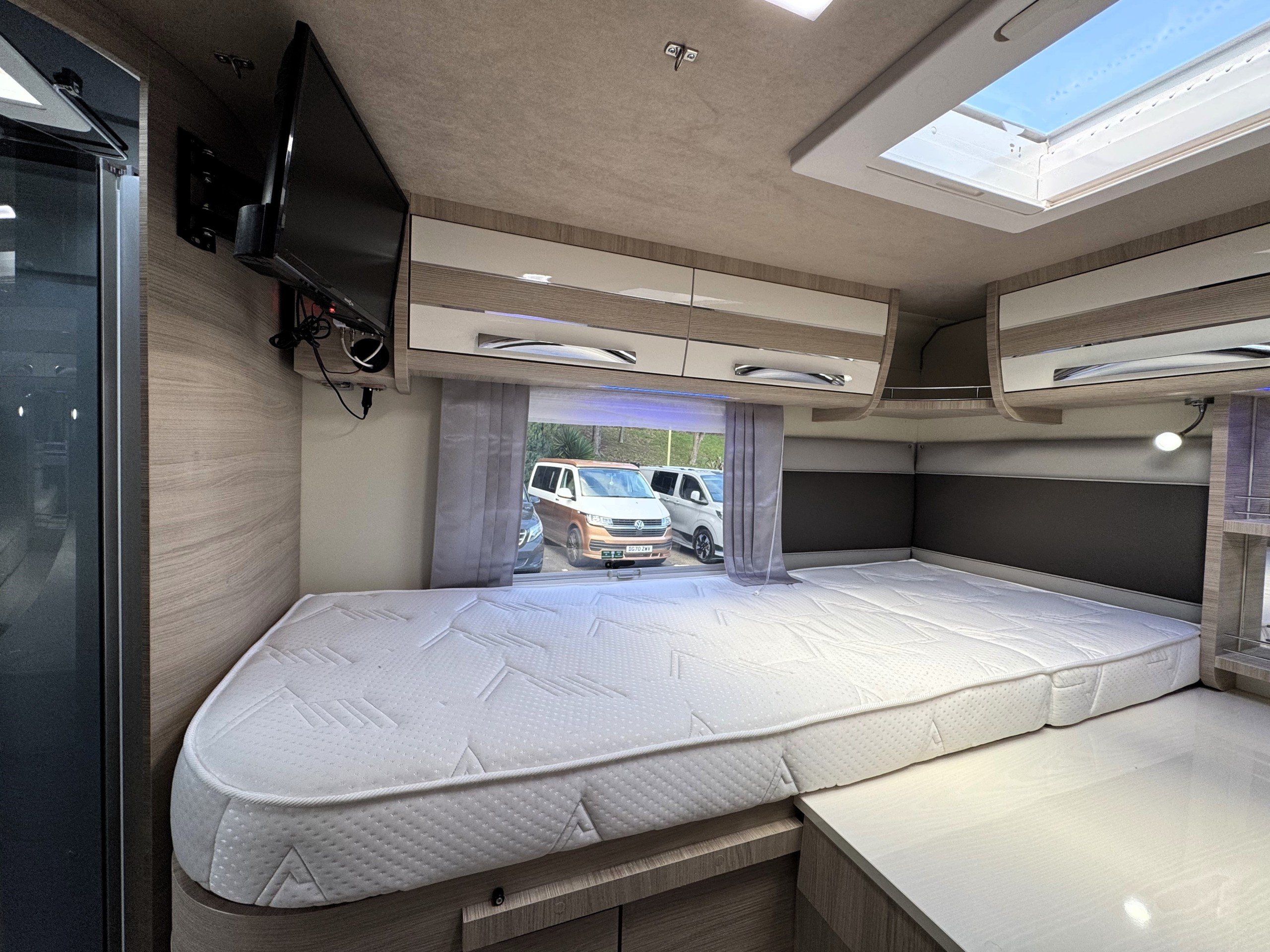 The end bedroom offers single or double bed option with memory foam mattress, large under bed wardrobe and additional storage cupboard with shelving, overhead cupboards, wall mounted 12v tv on swing wall bracket, large overhead roof heki light.