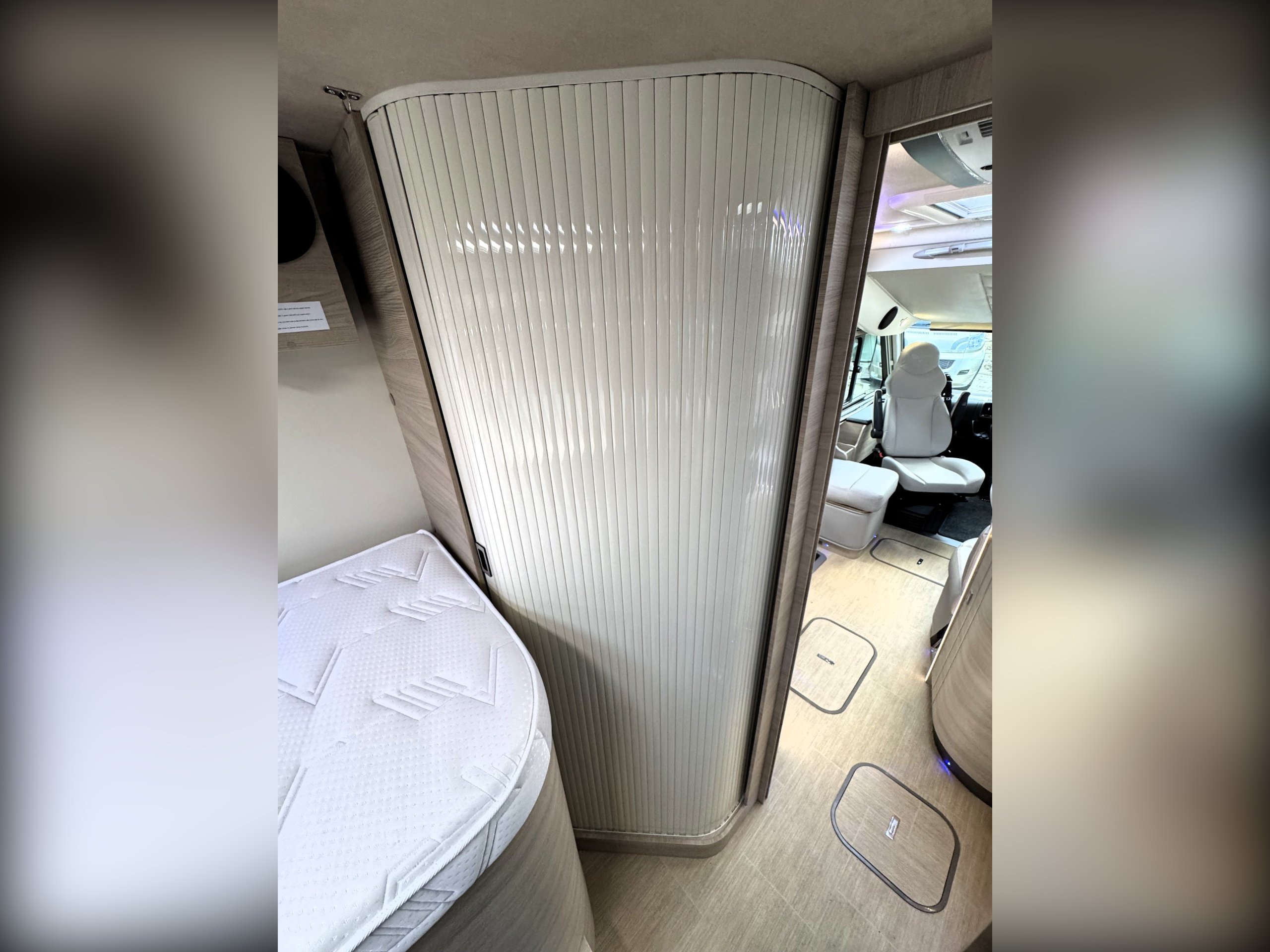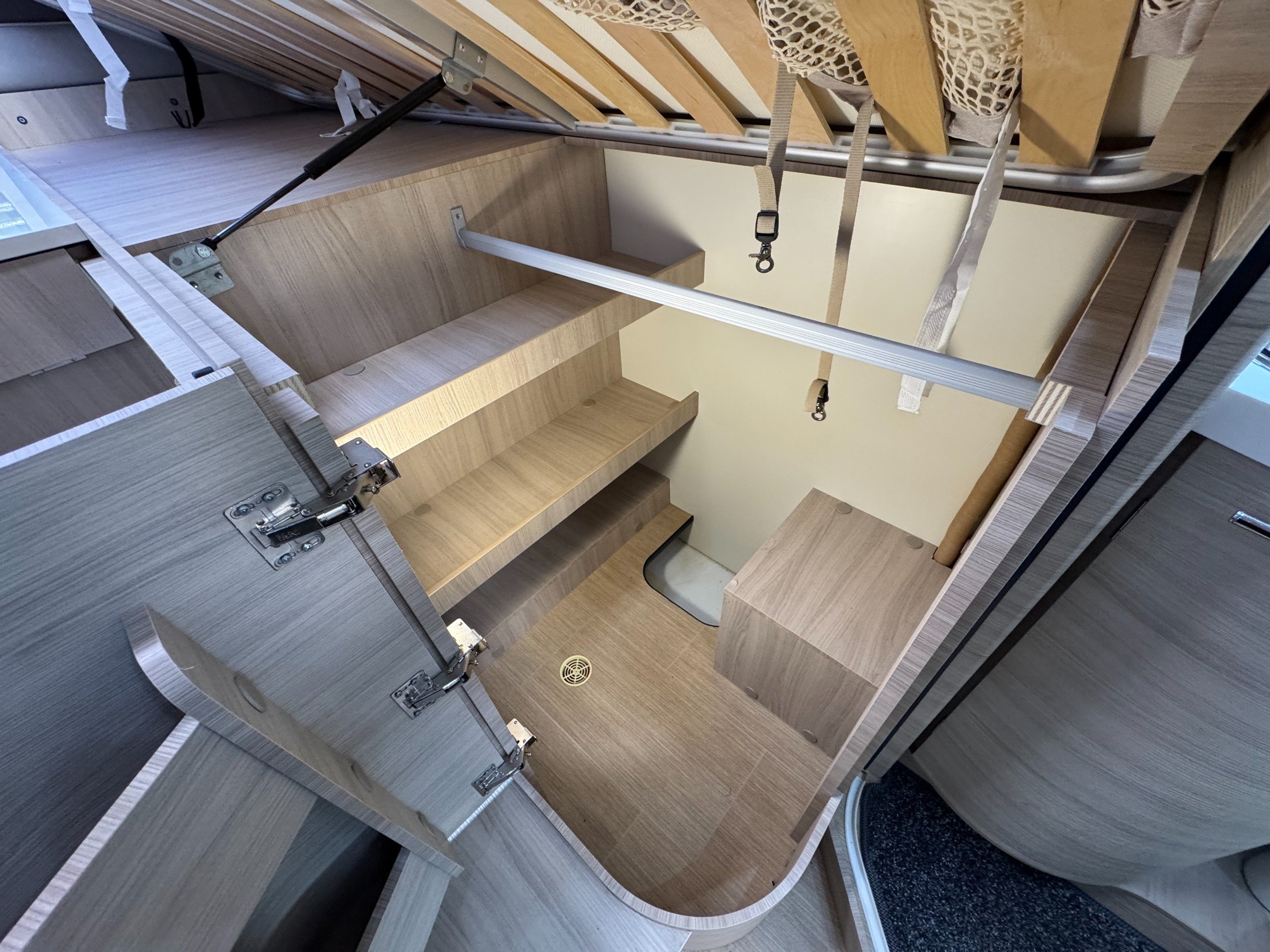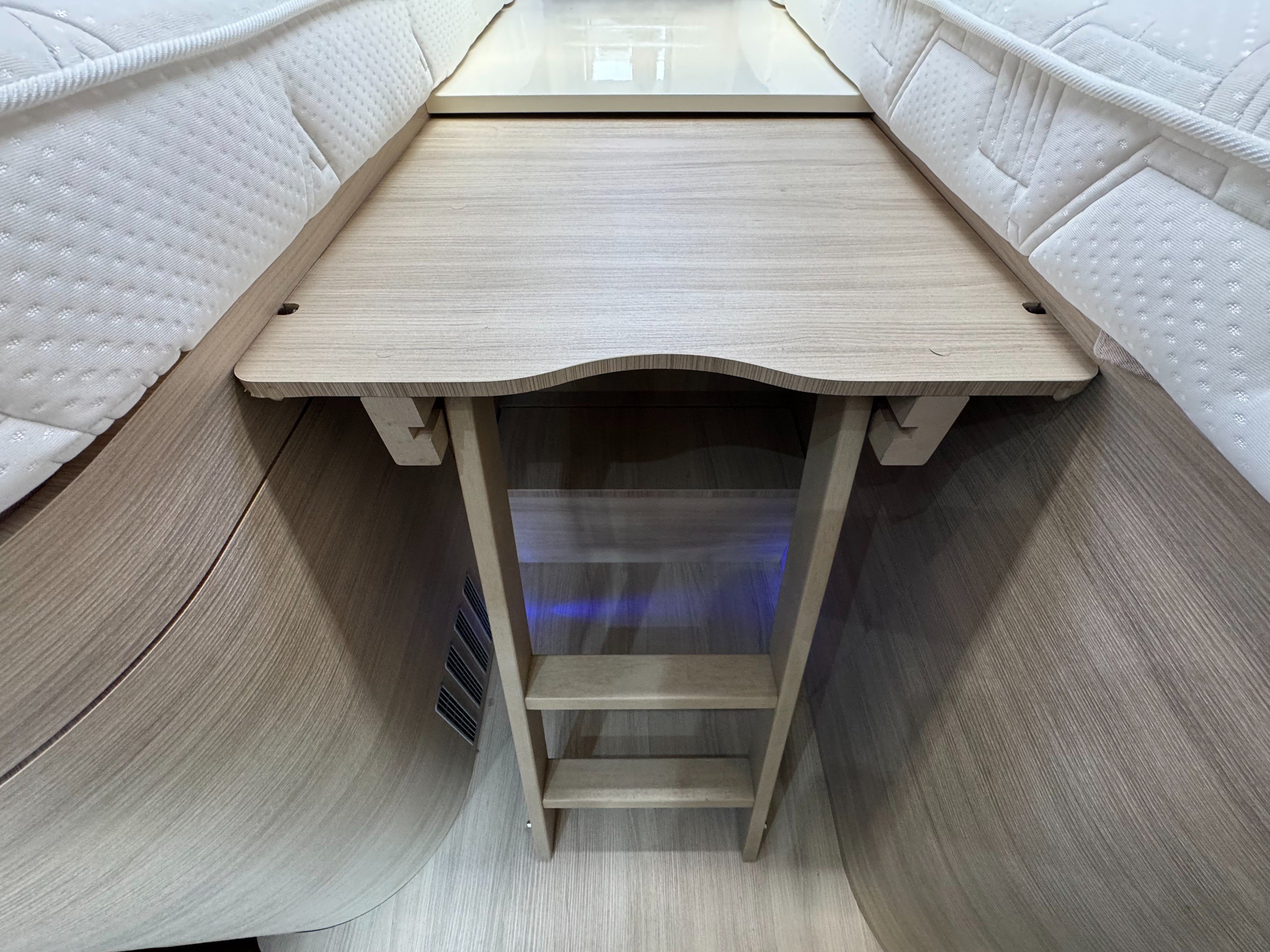 The end bedroom offers single or double bed option with memory foam mattress, large under bed wardrobe and additional storage cupboard with shelving, overhead cupboards, wall mounted 12v tv on swing wall bracket, large overhead roof heki light.