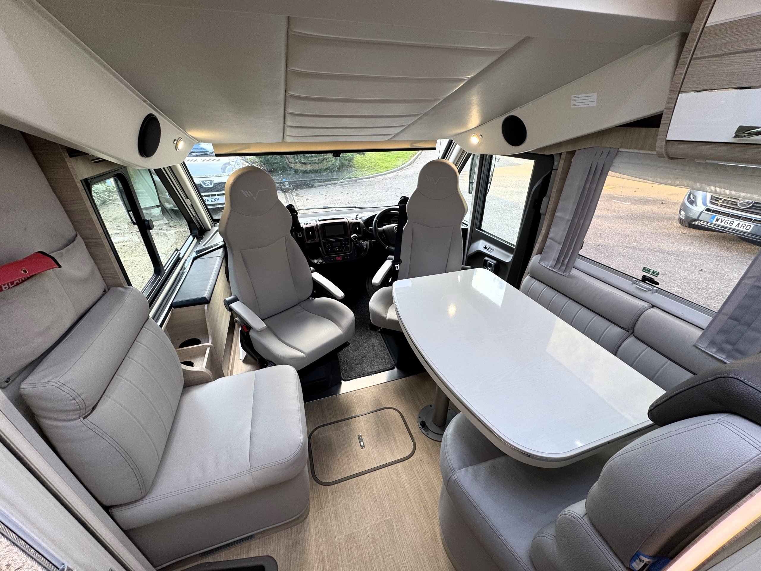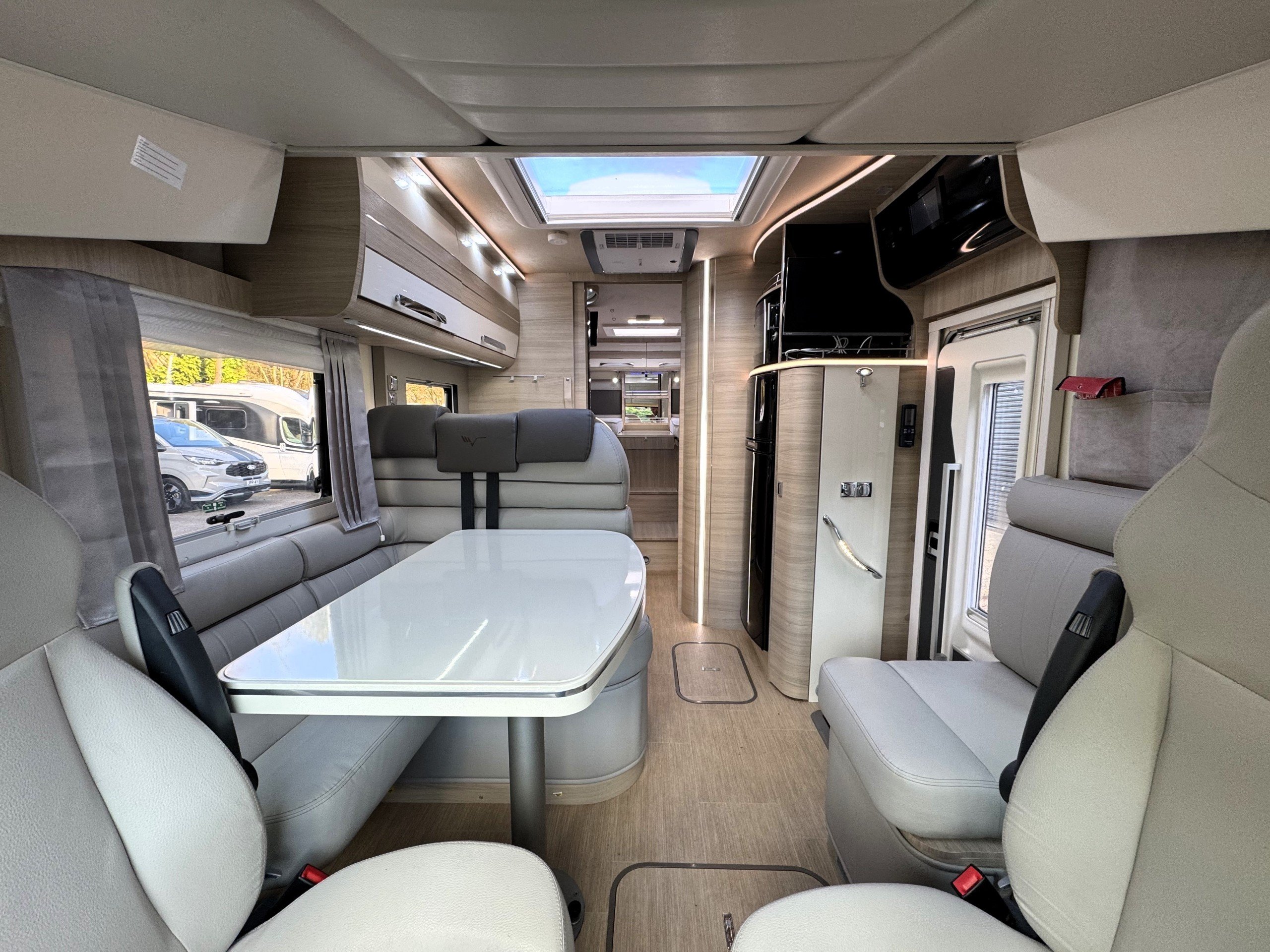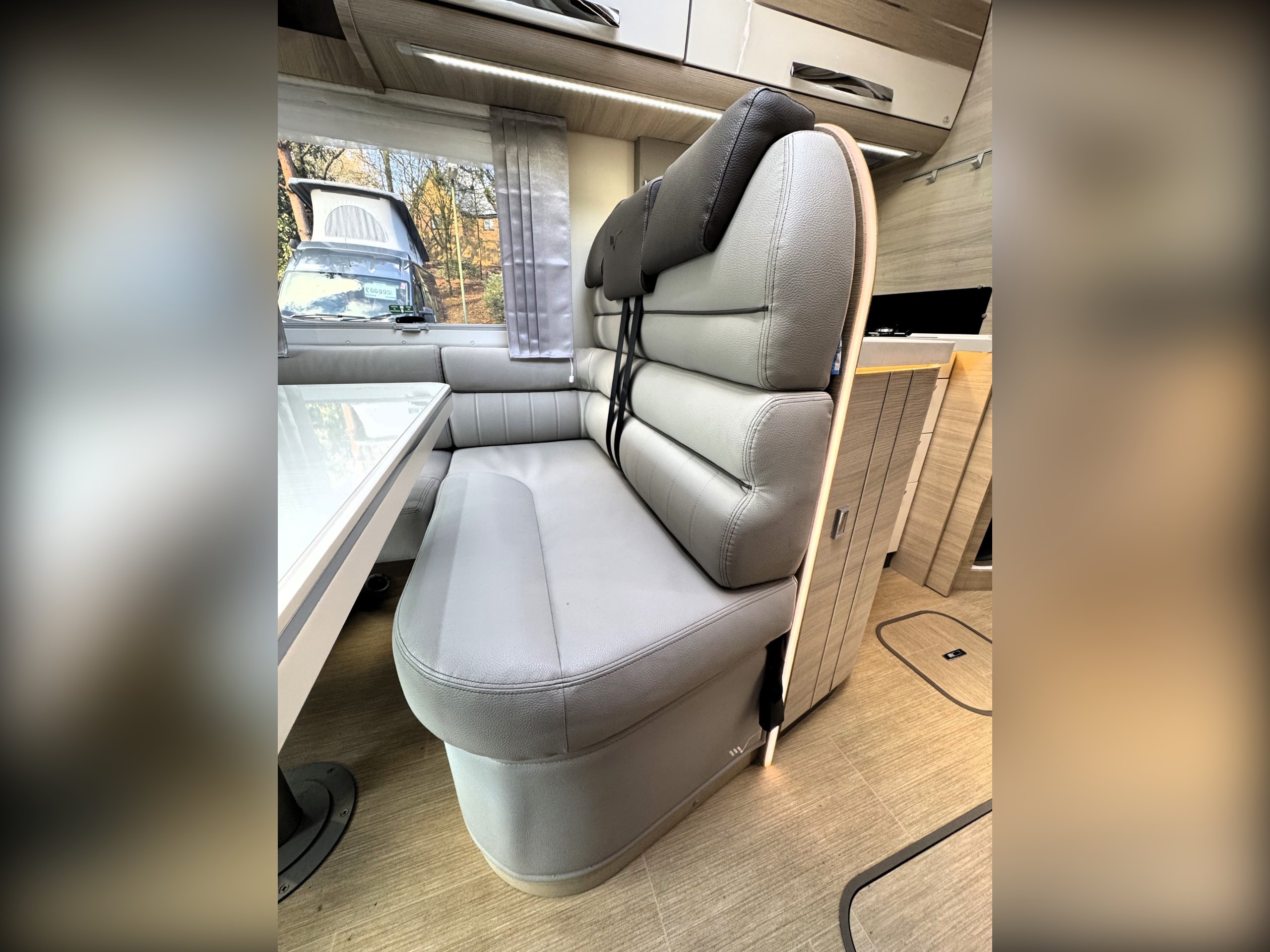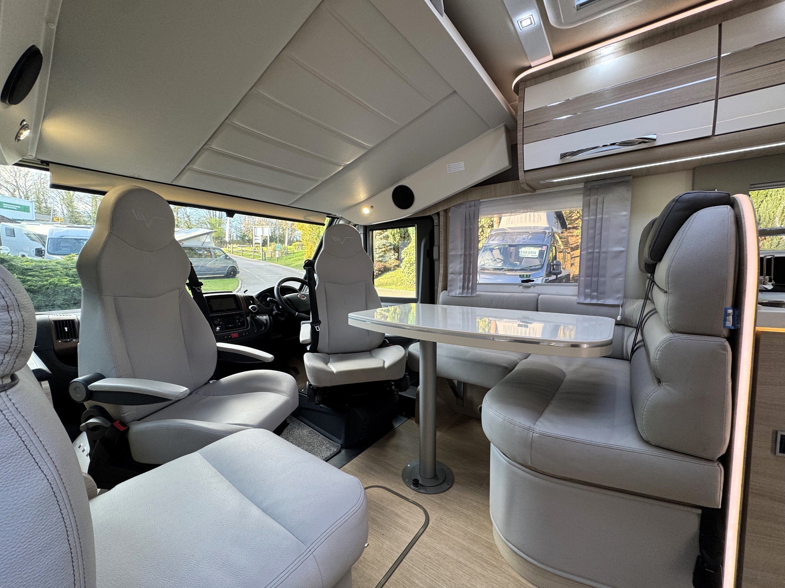 This 4 berth, 4 belts example consists of, front lounge with seating upto 6 people, full leather interior, ample overhead and under bench storage, large double drop down bed above cab with memory foam mattress, digital touch screen control panel with Truma dual fuel heating system, Full LED lighting throughout. Avtex 12v TV with slide out bracket.