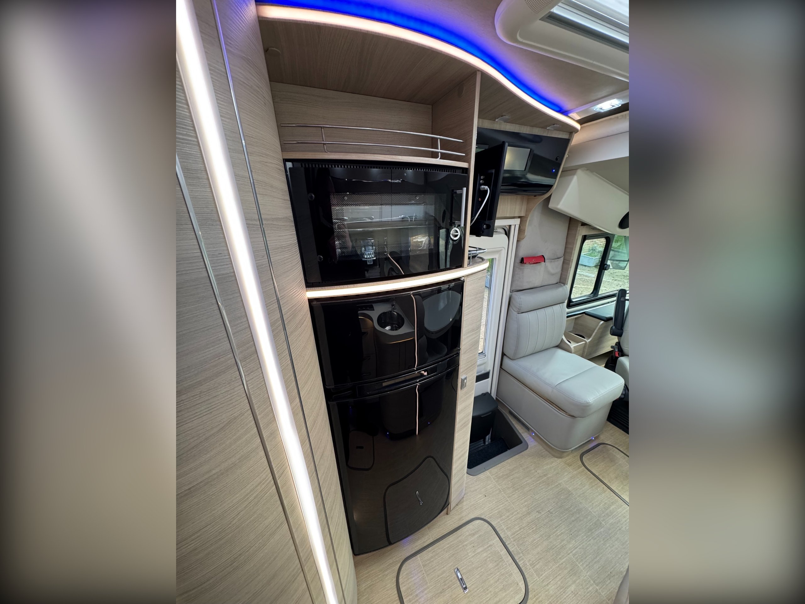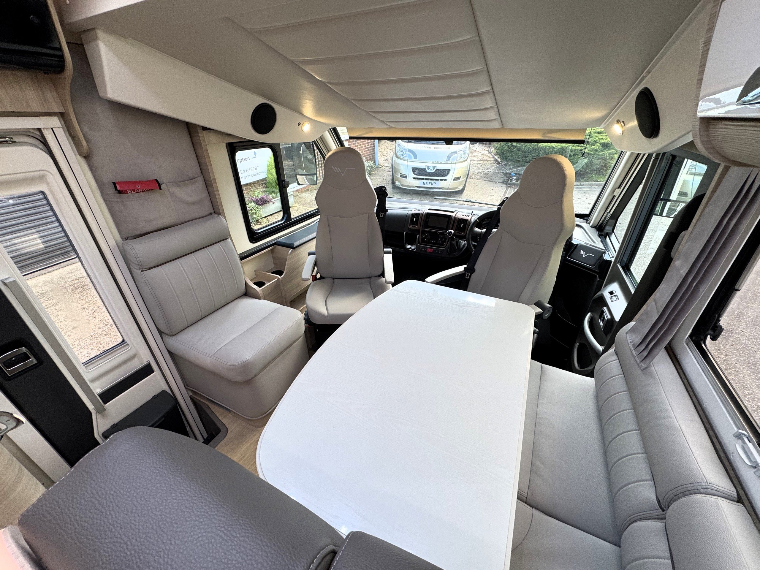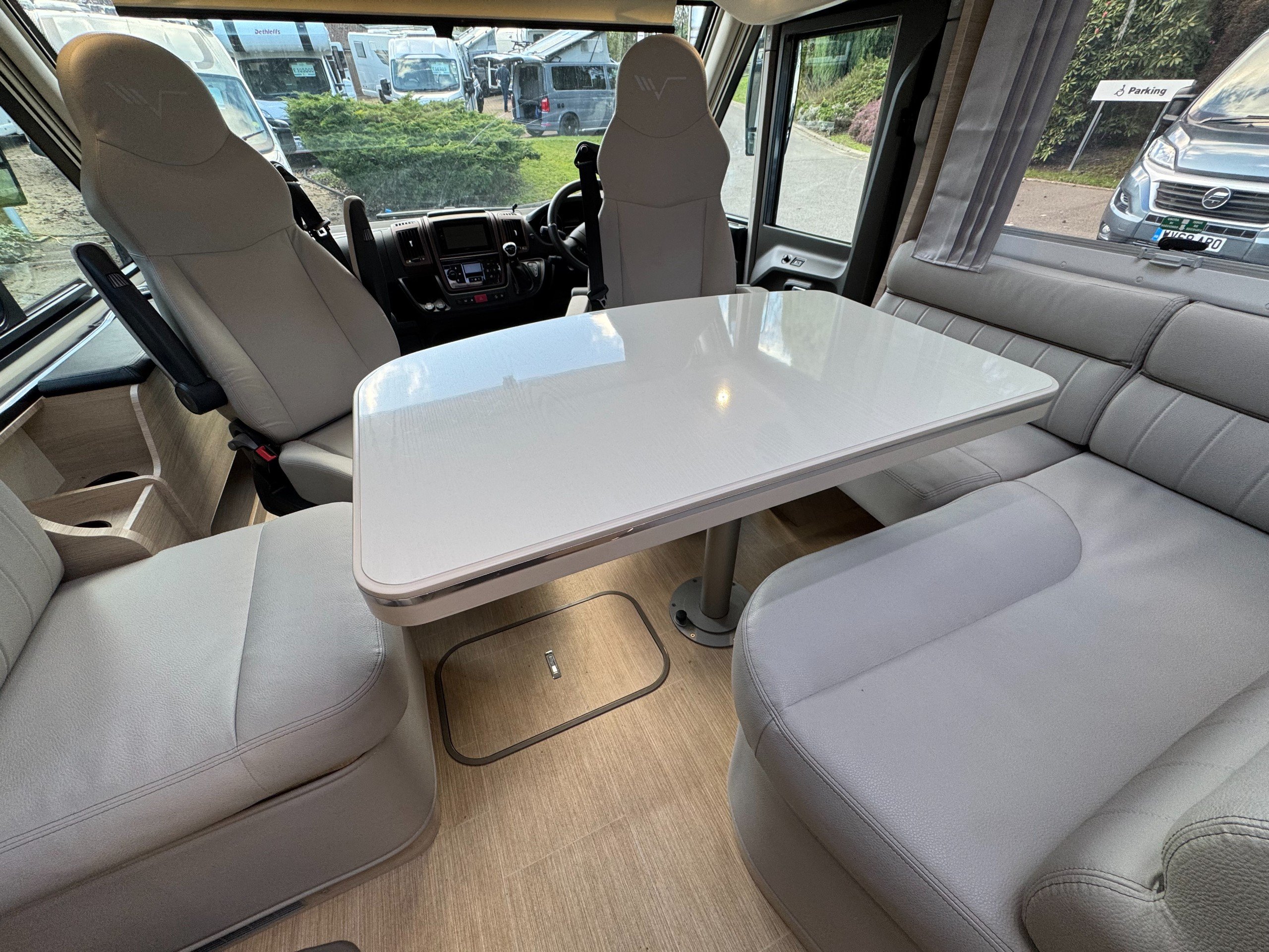 This 4 berth, 4 belts example consists of, front lounge with seating upto 6 people, full leather interior, ample overhead and under bench storage, large double drop down bed above cab with memory foam mattress, digital touch screen control panel with Truma dual fuel heating system, Full LED lighting throughout. Avtex 12v TV with slide out bracket.
