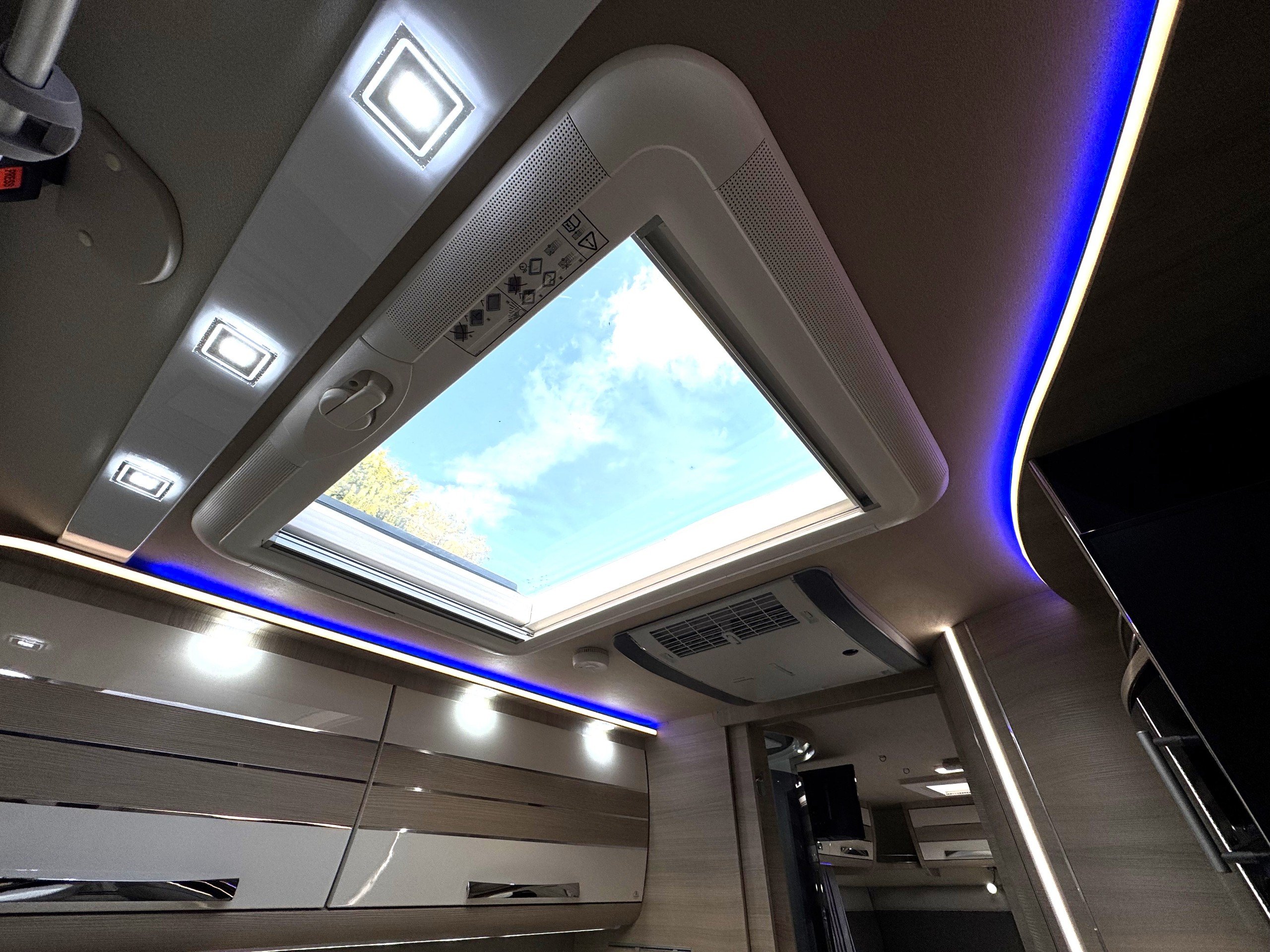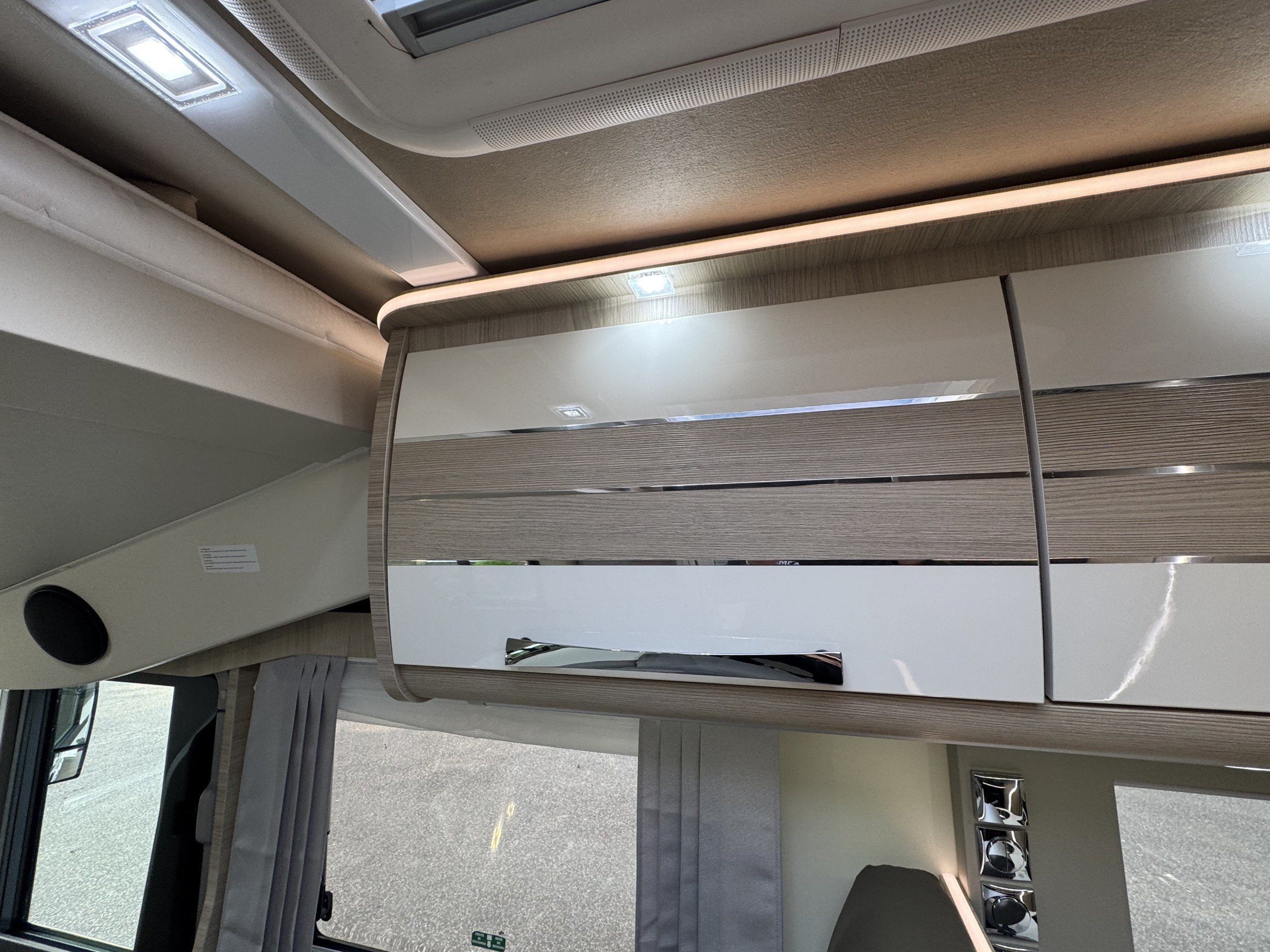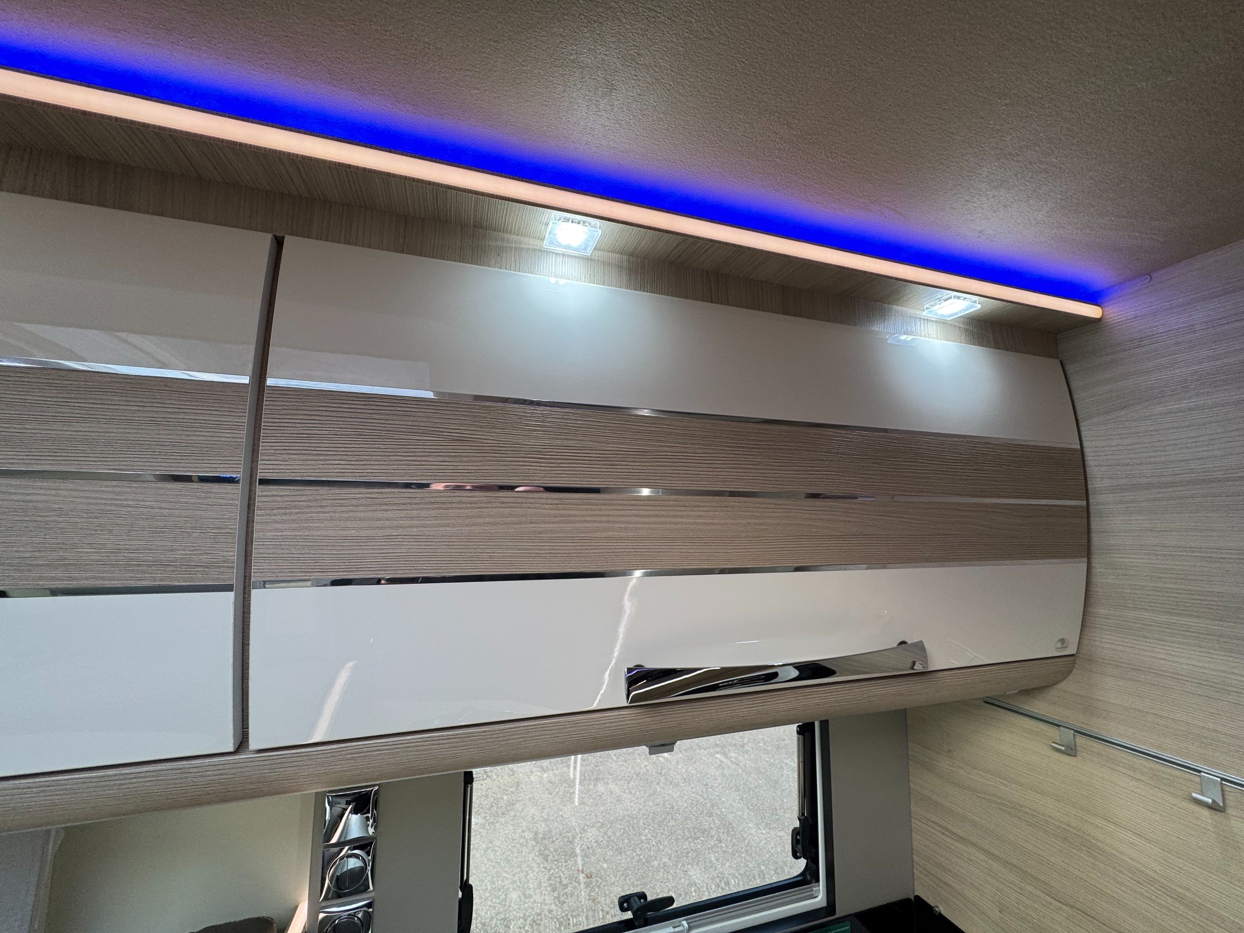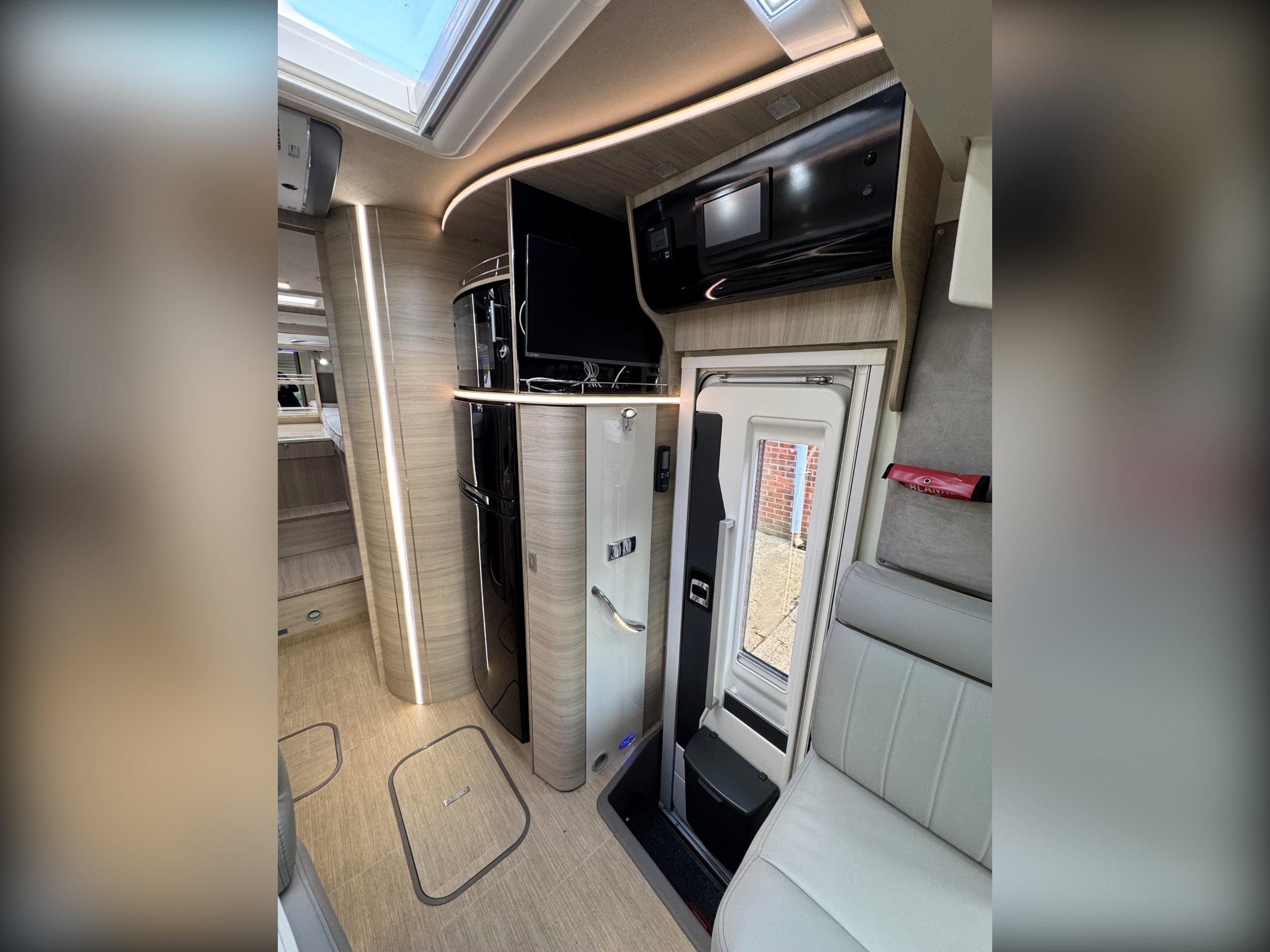 This 4 berth, 4 belts example consists of, front lounge with seating upto 6 people, full leather interior, ample overhead and under bench storage, large double drop down bed above cab with memory foam mattress, digital touch screen control panel with Truma dual fuel heating system, Full LED lighting throughout. Avtex 12v TV with slide out bracket.