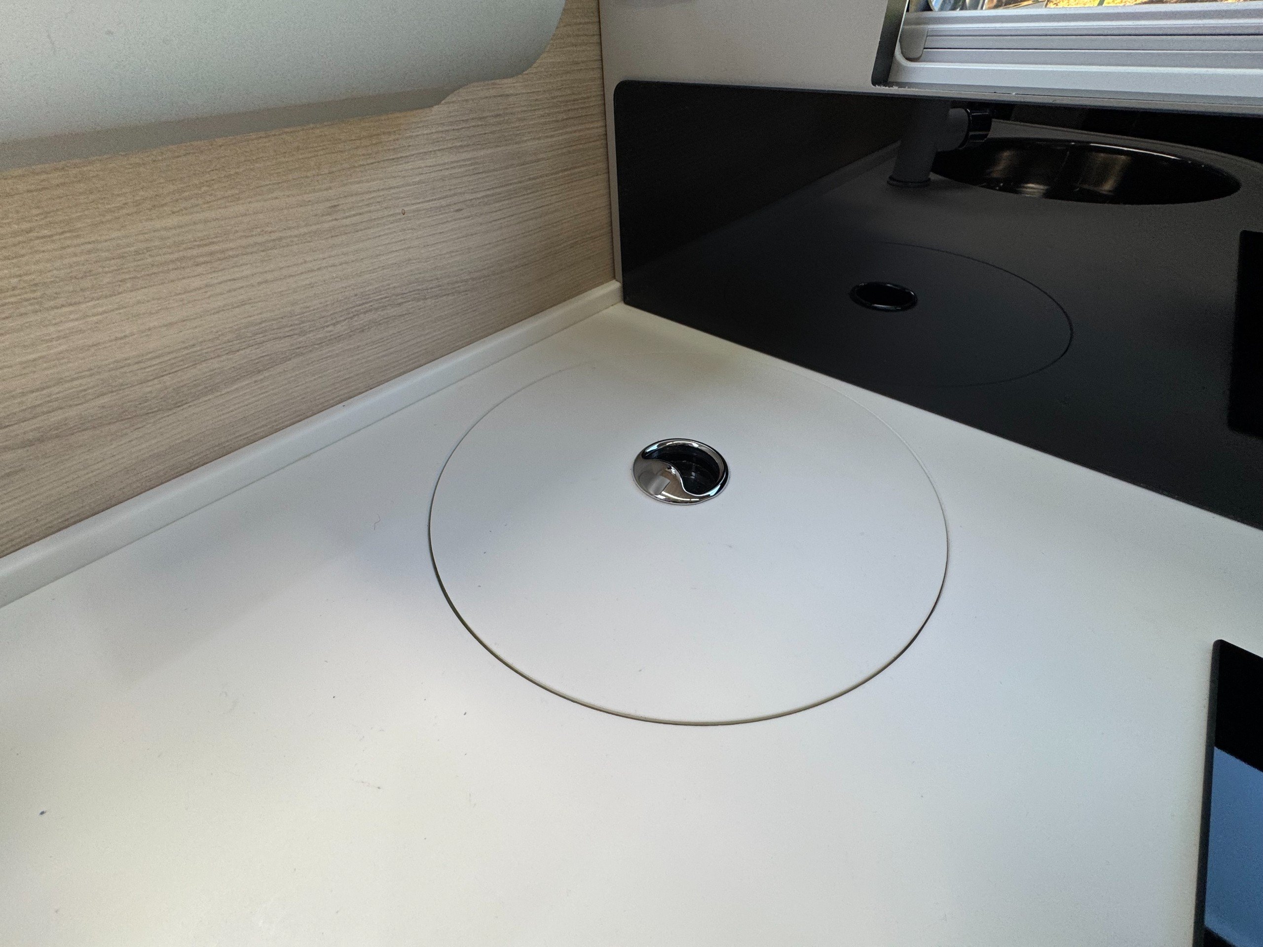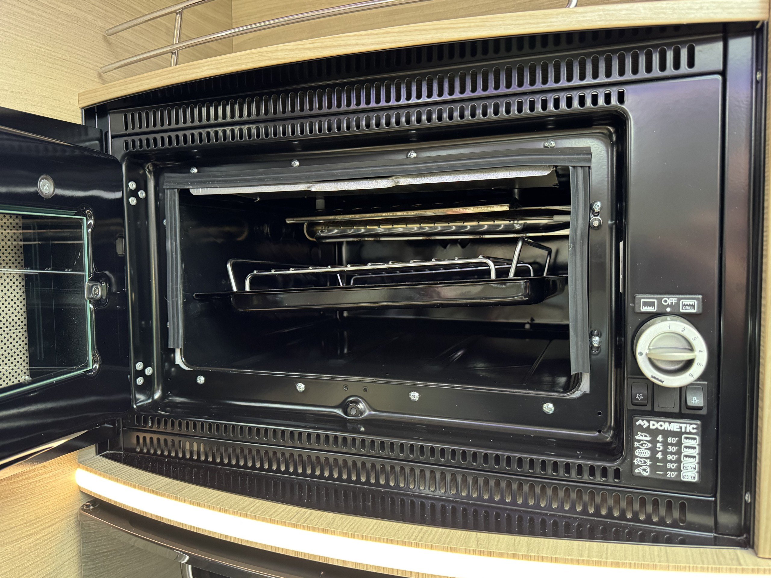Moving into the kitchen offers, Large fridge separate freezer, built in Dometic gas oven/grill, pull out storage cupboard with racking, single chrome bowl sink with chrome mixer tap, 2 burner gas hob with electric hob, ample under counter and overhead draw units and cupboards, worktop counter bin. Roof mounted Truma 2200watt air-con system.