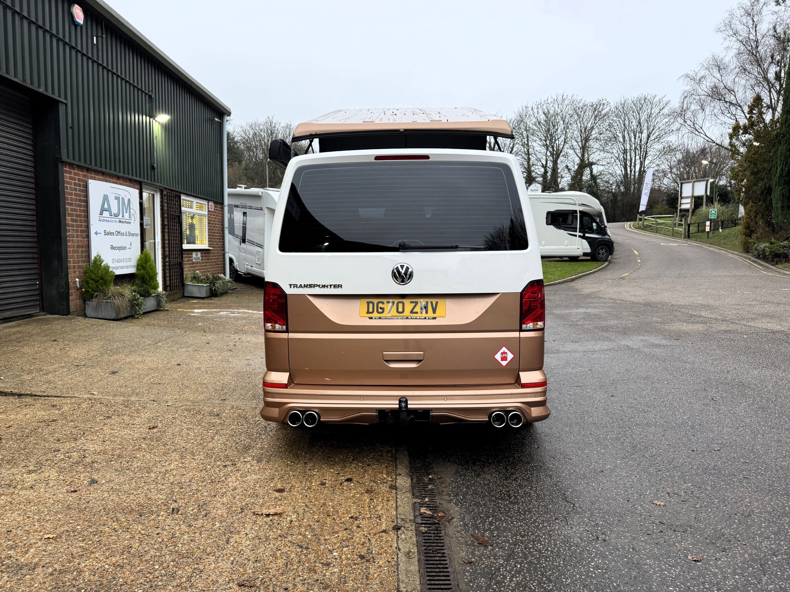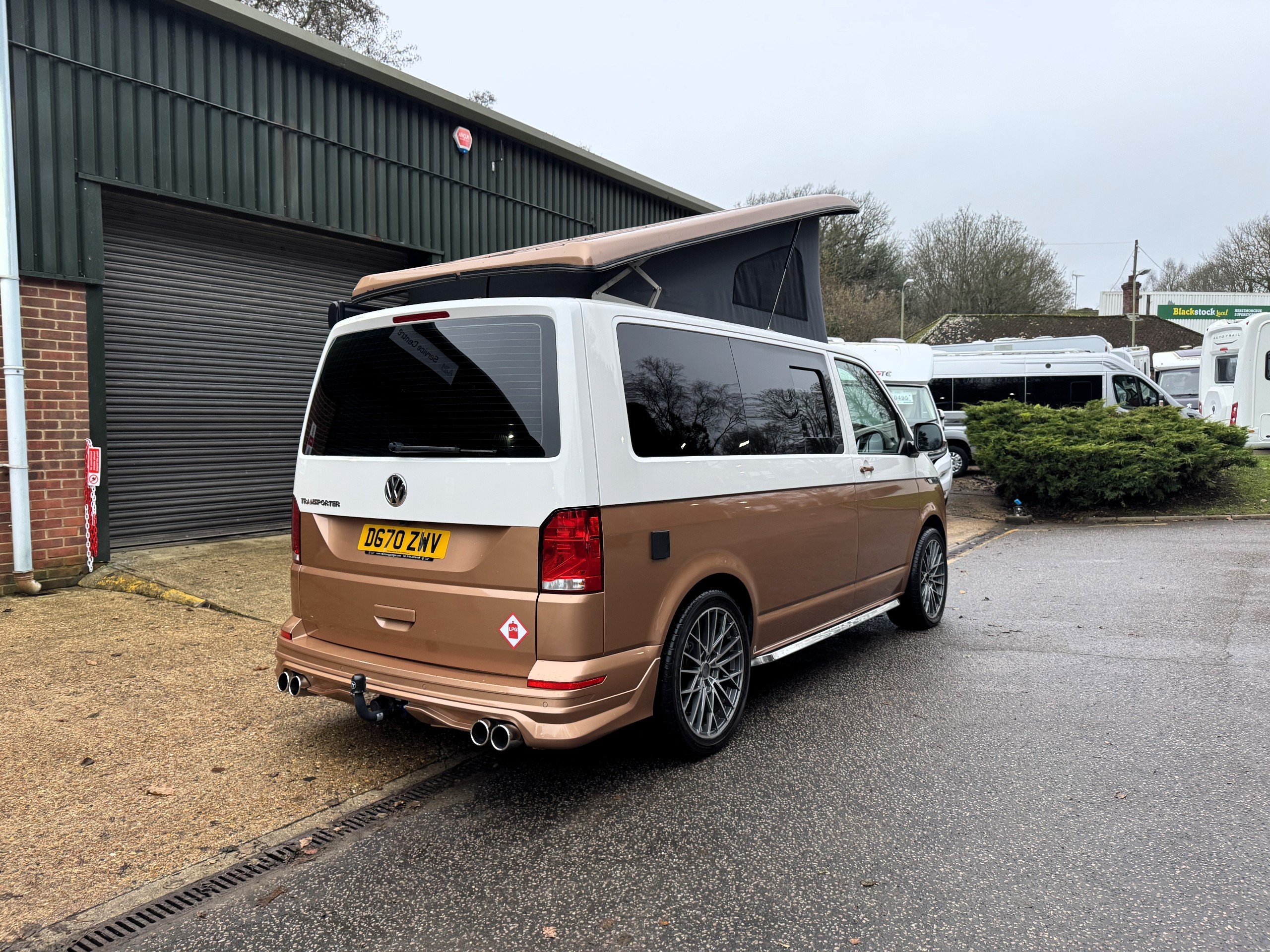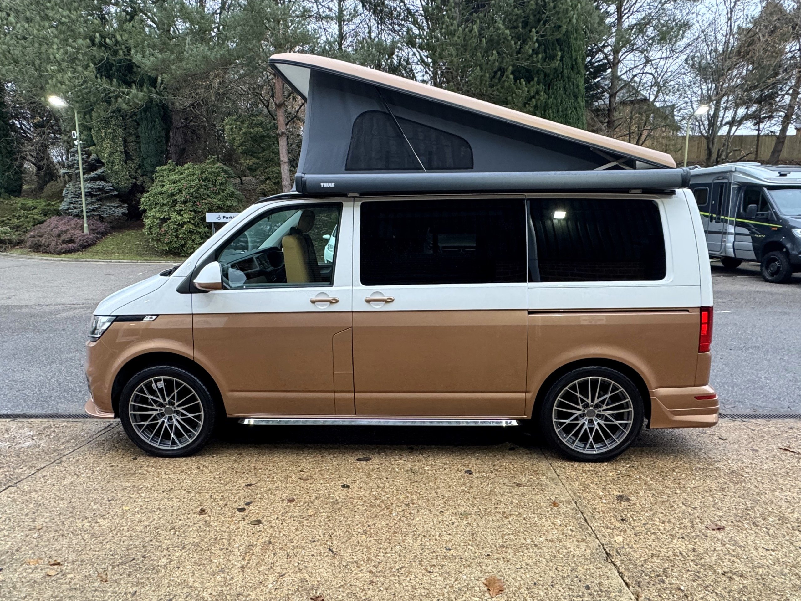 The exterior of this camper has been spec beautifully with full front bumper splitter, T6.1 Chrome side running bars, 20" Platinum alloys, wall mounted electrical mains hook-up point for sited connection, Thule Omnistor Awning, ABT style rear bumper with quad chrome exhaust tail pipes, Detachable Tow Bar with electrics