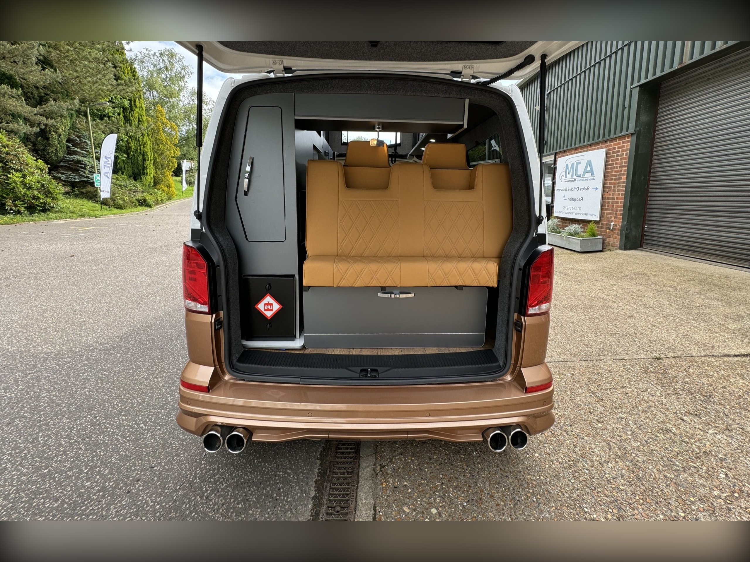 This is the stunning Platinum Wave Camper model selection and been selected with many options on build and this model example has the Windsor layout which gives the 2 seat/belted bench rear seating that converts to a very large rock and roll bed. The front seating gives you a further 3 belted seats and the front passenger bench seat rotates to give further seating to the habitation area when sited. The full leather interior is Light Tan with the subtle white cross hatch stitching with the VW logo and has been tailored to the highest quality.
